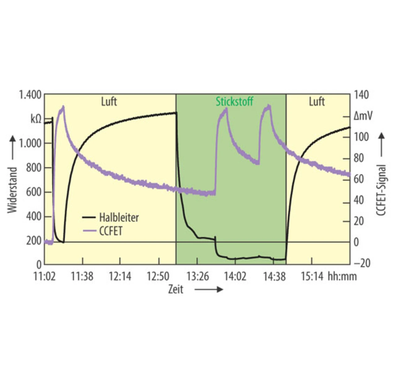 Da diese Sensor-Technologie den Sauerstoff aus der Luft zur Absorption benötigt, wird seine Abwesenheit als Signal interpretiert. Der CCFET dagegen geht nur eine physikalische Oberflächenbindung mit bestimmten Analyten ein und ließ während der Messung keine negative Beeinflussung erkennen.