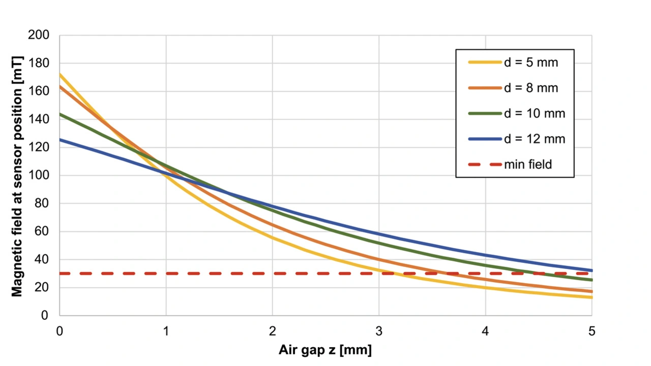 Bei diesem berührungslosen Verfahren handelt es sich um ein verschleißfreies Erkennungsprinzip. Es ist wichtig sicherzustellen, dass keine Schwankungen der Lebensdauer des Mechanismus die Zuverlässigkeit der Erfassung beeinträchtigen könnten. Bild 8 zeigt eine Überlagerung der magnetischen Schwellenwerte des MA800 und der zugehörigen Hystereseintervalle über der Feldstärkekurve für die typische Konfiguration. Der nominelle magnetische Aufbau ist so ausgelegt, dass beide Endpunkte einen ausreichenden Abstand zur magnetischen Schaltschwelle haben, um sicherzustellen, dass Fremdpartikel, die sich im Laufe der Zeit ansammeln können, die mechanische Bewegung bis zu einem Punkt, an dem die Schaltschwellen nicht überschritten werden, nicht behindern.
