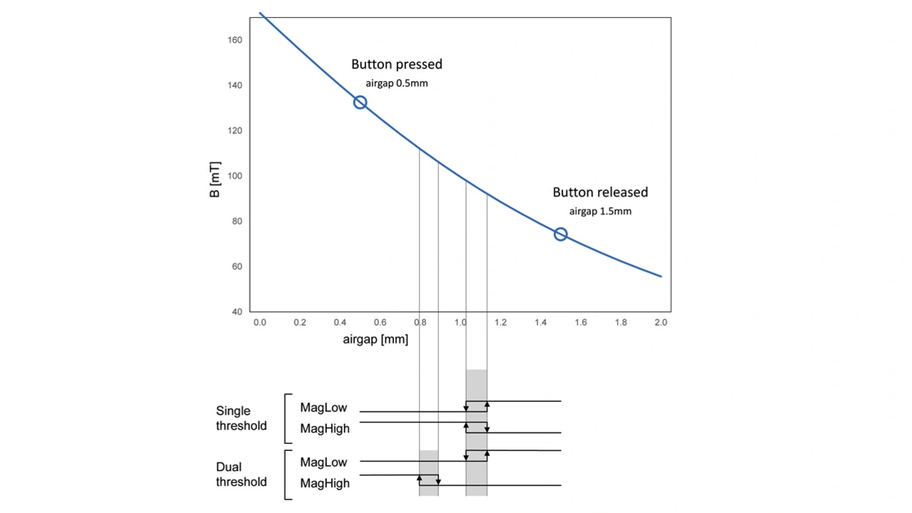 Wenn die Magnetfelddifferenz entlang der axialen Bewegung groß genug ist, um sicher mehr als eine Schaltschwelle zu überschreiten, empfiehlt es sich, unterschiedliche Schwellenwerte zur Erkennung der hohen und niedrigen Feldstärken zu verwenden. Bild 8 zeigt eine Skizze für eine solche Dual-Threshold-Konfiguration. Ein doppelter Schwellenwert erweitert die Gesamtanwendung um Sicherheitsfunktionen, da er mechanische Fehler erkennt, falls der Knopf in einer mittleren Position hängen bleibt.