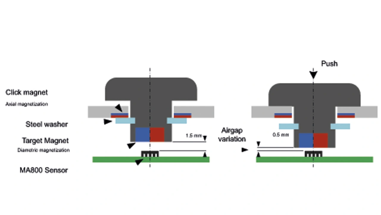 Einige HMI-Anwendungen erfordern zusätzlich zur Drehfunktion einen Druckknopf. Der MA800 erkennt ein Druckknopfereignis, wenn Änderungen im Luftspalt zu Schwankungen der Magnetfeldstärke führen. Bild 7 zeigt eine typische Struktur für einen Druckknopf-Kombinationsknopf.