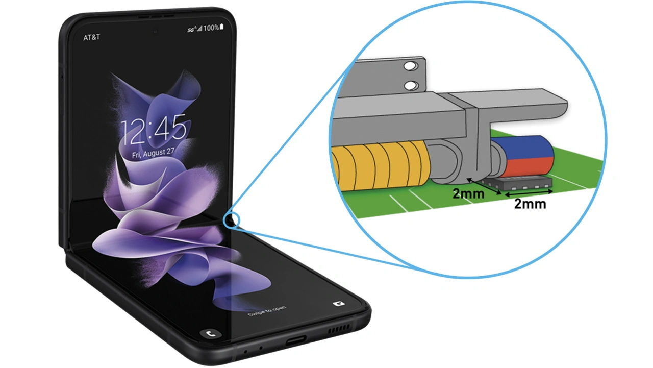 Da der MA782 auch in einem UTQFN-14-Gehäuse (2 mm × 2 mm) geliefert wird, kombiniert er eine extrem stromsparende Abtastung mit einer extrem kleinen Stellfläche. Eine Kombination, die von entscheidender Bedeutung für neue Anwendungen ist, beispielsweise für drahtlose Thermostate in Privathaushalten oder Scharniersteuerungen in faltbaren Mobiltelefonen (Bild 9).