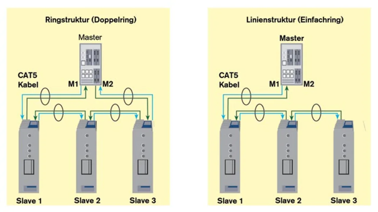 Da Sercos-III also nicht die Sterntopologie des Standard-Ethernet nutzt, finden Hubs oder Switches keine Verwendung.