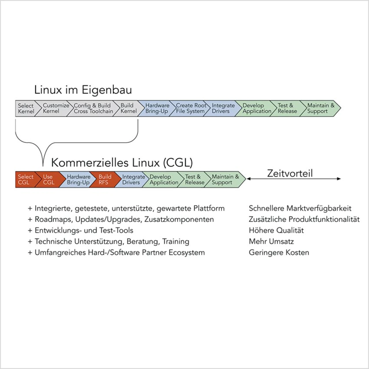 Der Vorteil von Linux im Eigenbau liegt in der vollständigen Beherrschung des Systems. Hier sind sämtliche Schritte vom Kernel bis zur Applikation selbst zu erledigen. Als problematisch zeigt sich der relativ große Zeitaufwand. Schneller geht es mit der Unterstützung eines Linux-Service- Provider, Linux-Consultants oder Open-Source-Software-Organisationen wie das Open Source Automation Development Lab (OSADL). Einige Linux-Service-Provider bieten eigene Toolchains an, zum Beispiel ELDK (Denx) und OSELAS (Pengutronix). Auch ist zu beachten ist, dass die Anpassung und kontinuierliche Wartung, beispielsweise für das Einpflegen von Sicherheits- Patches, langfristig Entwicklungs-Ressourcen binden, die bei der Applikations-Entwicklung eventuell fehlen.