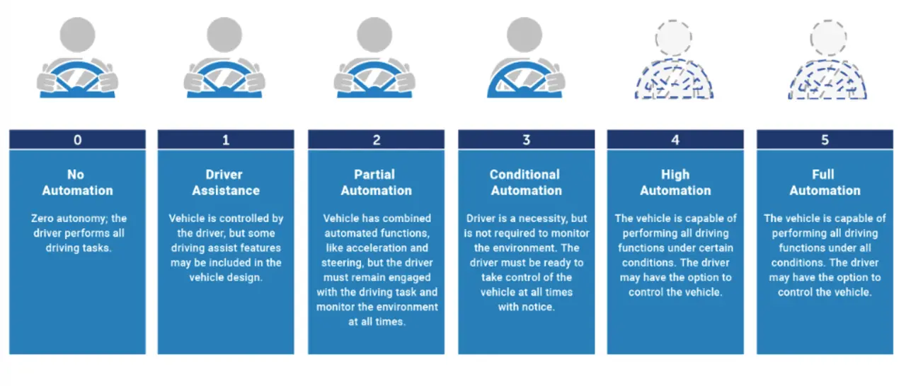 Hochentwickelte Fahrerassistenzsysteme bilden die Grundlage für das autonome Fahren und arbeiten im vollautonomen Modus mit fortschrittlichen und komplexen Anwendungen zusammen. Im teilautonomen Modus (Level 1 bis Level 3) warnen sie den Fahrer beispielsweise direkt vor drohenden Situationen. Die verschiedenen Ebenen der Automatisierung eines Fahrzeugs sind in Bild 1 dargestellt.