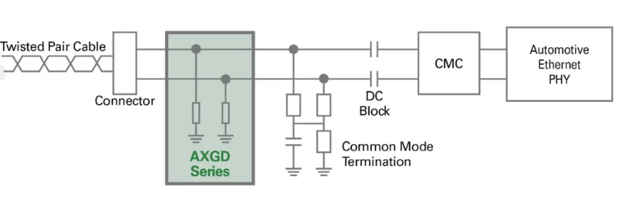 Bild 4 zeigt, wo ein Baustein der AXGD-Serie in der Ethernet-Verbindung von einem differenziellen Twisted Pair zum Ethernet PHY angeordnet wird. Mit einer schnellen Reaktionszeit und der Fähigkeit, 50-A-Transienten von bis zu 30 kV zu absorbieren, schützt die AXGD-Serie ein Differenzialpaar in einem einzigen Bauteil. Mit seinem besonders niedrigen Kapazitätswert hat der ESD-Schutz außerdem keinen Einfluss auf Ethernet-Datenübertragungsraten bis 1 Gbit/s.