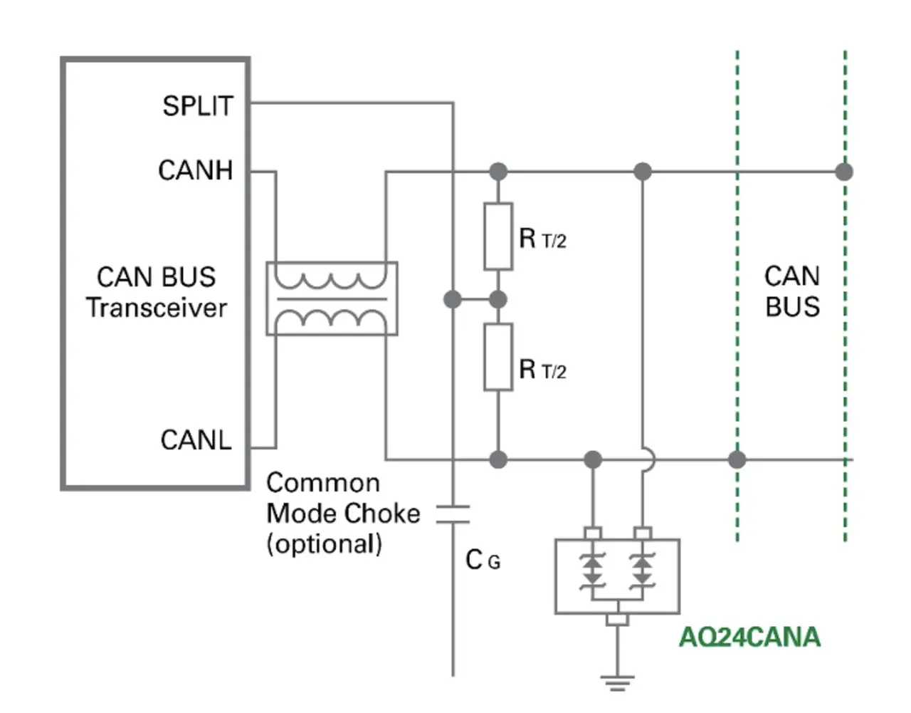 Für die CAN-Transceiver-Schnittstelle werden Dioden-Arrays zum Schutz vor schnellen Transienten und ESD empfohlen. Bild 5 veranschaulicht die Verwendung eines Dioden-Arrays der AQ24CANA-Serie von Littelfuse.