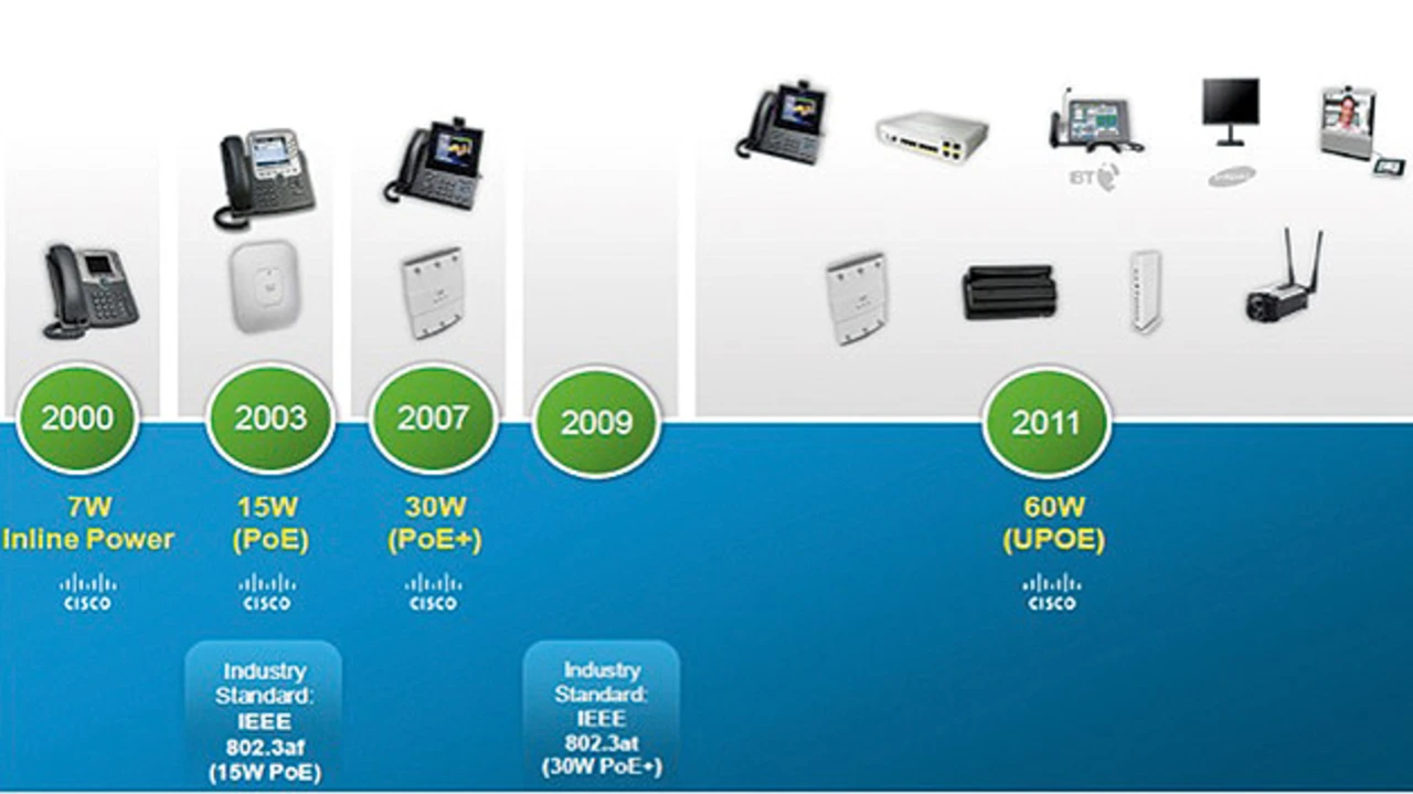 Im Jahr 2011 hat Cisco eine neue 60-W-PoE-Technologie namens UPOE vorgestellt (Bild 1). IEEE arbeitet ebenfalls an einem neuen Standard für höhere Leistungsanforderungen. Mit einer Leistung von 60 W und einer möglichen Erweiterung auf 90 W, die über ein Standard Cat5e- oder Cat6-Ethernet-Kabel mit RJ-45-Anschluss bereitgestellt werden kann, ermöglicht die PoE-Technologie die Stromversorgung eines außergewöhnlich breiten Spektrums an Produkten, z.B. Thin Clients, IPTVs, IP-Turrets, ferngesteuerten Videokameras, Point-of-Sale Terminals und weiteren Geräten, die derzeit noch eine separate Stromversorgung benötigen.
