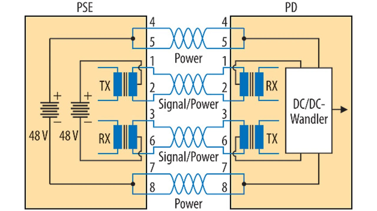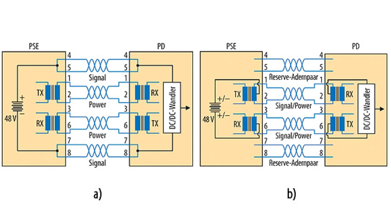 Bei einem typischen 15-W-PoE oder 30-W-PoE+-System wird die Versorgungsspannung von der Stromversorgung zum versorgten Gerät über zwei der vier Twisted-Pair-Leitungen eines Standard Cat5e- oder Cat 6-Kabels übertragen. Zwei Varianten dieses Anschlussschemas sind möglich: Beim gebräuchlichsten Implementierungsschema wird die Energie auf die Signaladernpaare gelegt (Bild 2a), beim anderen werden die Reserve-Adernpaare zur Energieübertragung verwendet (Bild 2b). In jedem Fall liefert die PSE eine Nenn-Gleichspannung von 48 V jeder Polarität an das PD. Jedes PD entnimmt seine Versorgungsspannung unter Verwenden einer Diodenbrücke, über die diese an die Wandlerschaltung weitergegeben wird.