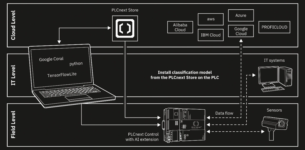 Das Modell ließe sich anschließend mit der PLCnext Control und dem Erweiterungsmodul AXC F XT ML 1000, das die Google-Coral-TPU umfasst, für die einzelnen Maschinen vervielfältigen. Weil die PLCnext Control mit zahlreichen gängigen Cloud-Lösungen kommunizieren kann, ist es ferner möglich, die Ergebnisse der verschiedenen lokalen KI-Anwendungen zentral auszuwerten. Auf Basis dieser Erkenntnisse lässt sich das KI-Modell im nächsten Schritt weiter trainieren. So entsteht ein kontinuierlicher Verbesserungsprozess für die KI-Anwendung, der auf den realen Daten unterschiedlicher Maschinen beruht: ein echter Mehrwert sowohl für Hersteller als auch für Betreiber von Maschinen.