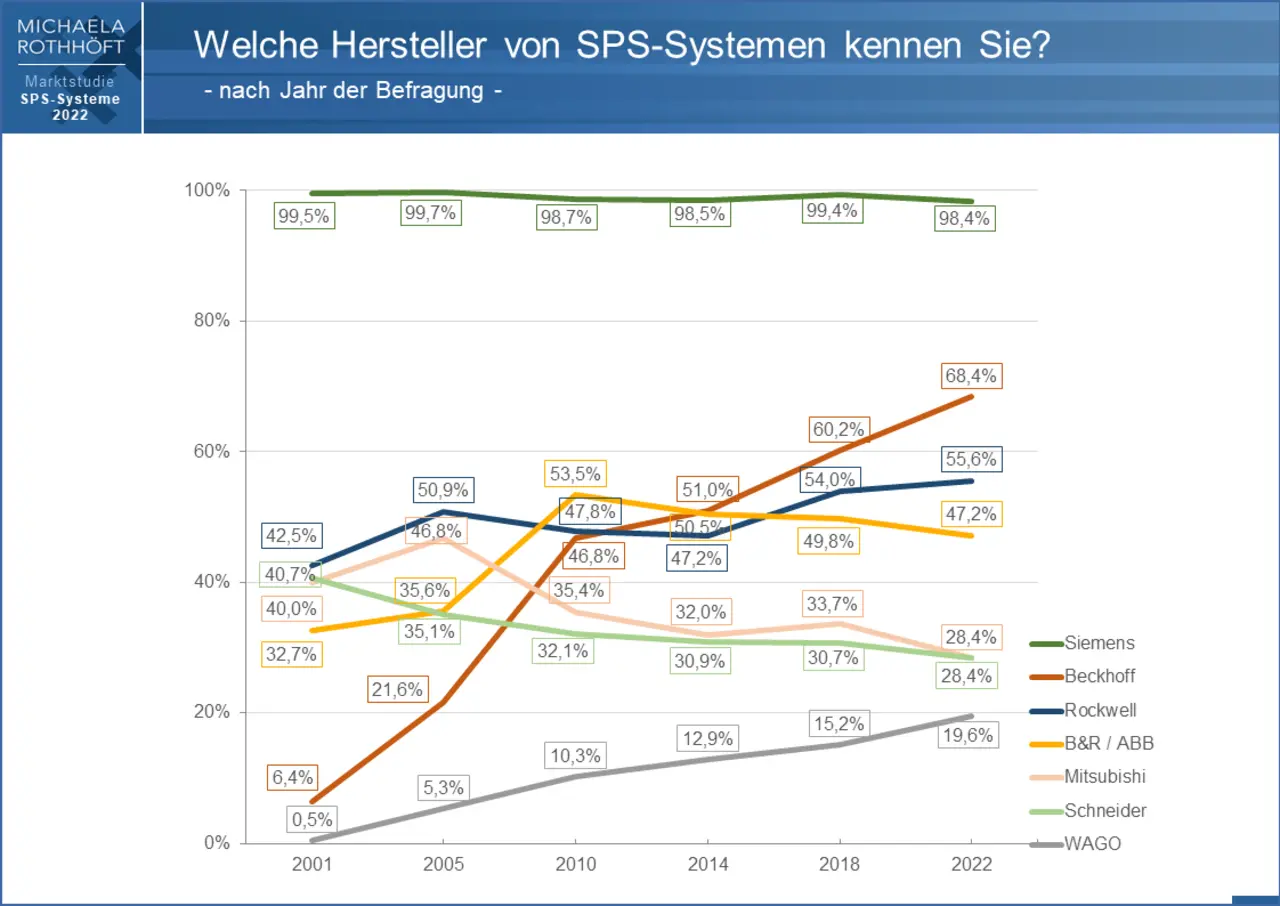 Der Markt für SPS-Systeme wird laut der Studie in Deutschland weiterhin von Siemens dominiert. Das Unternehmen hat demnach seine herausragende Stellung im Markt sowohl beim Bekanntheitsgrad als auch bei Kaufentscheidungen in den letzten 20 Jahren gehalten. Am stärksten hat sich in den vergangenen Jahrzehnten Beckhoff Automation entwickelt. 2001 mit 6 Prozent noch weitgehend unbekannt, steht das Unternehmen der Studie zufolge jetzt mit 68 Prozent an zweiter Stelle des Bekanntheitsgrads, was auch zu einer starken Zunahme der Kundenzahl geführt hat. Diese Entwicklung zeige, dass auch ein damals noch kleines Unternehmen (im Vergleich zu internationalen Konzernen) durchaus Chancen habe, in einem schwierigen Markt große Erfolge zu feiern. Das Unternehmen profiliere sich dabei vor allem durch die Erfüllung technischer Anforderungen.