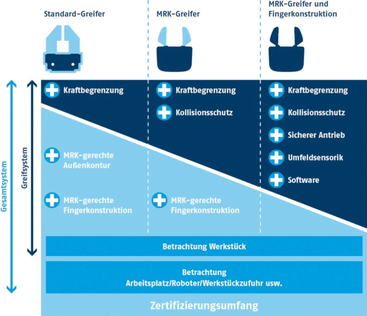 Normative Grundlagen für die funktionale Sicherheit von MRK-Anwendungen sind allgemeine Normen wie IEC 61508, IEC 62061 sowie ISO 13849-1 und -2. Darüber hinaus sind ISO 10218-1 und -2 zur Sicherheit von Industrierobotern zu berücksichtigen.In der technischen Spezifikation ISO/TS 15066:2017-04 sind speziell die für Roboter im Kollaborationsbetrieb und Robotikgeräte wichtigen Einsatzanforderungen festgelegt. Sie enthält unter anderem detaillierte Angaben über einzuhaltende Schmerzschwellen für die jeweiligen Körperregionen. Daraus leitet sich bei Greifern für kollaborative Anwendungen das Limit von 140 N Greifkraft pro Finger ab, bis zu dem ein Greifer als sicher eingestuft wird – vorausgesetzt es handelt sich um flächig gestaltete Greiferfinger.