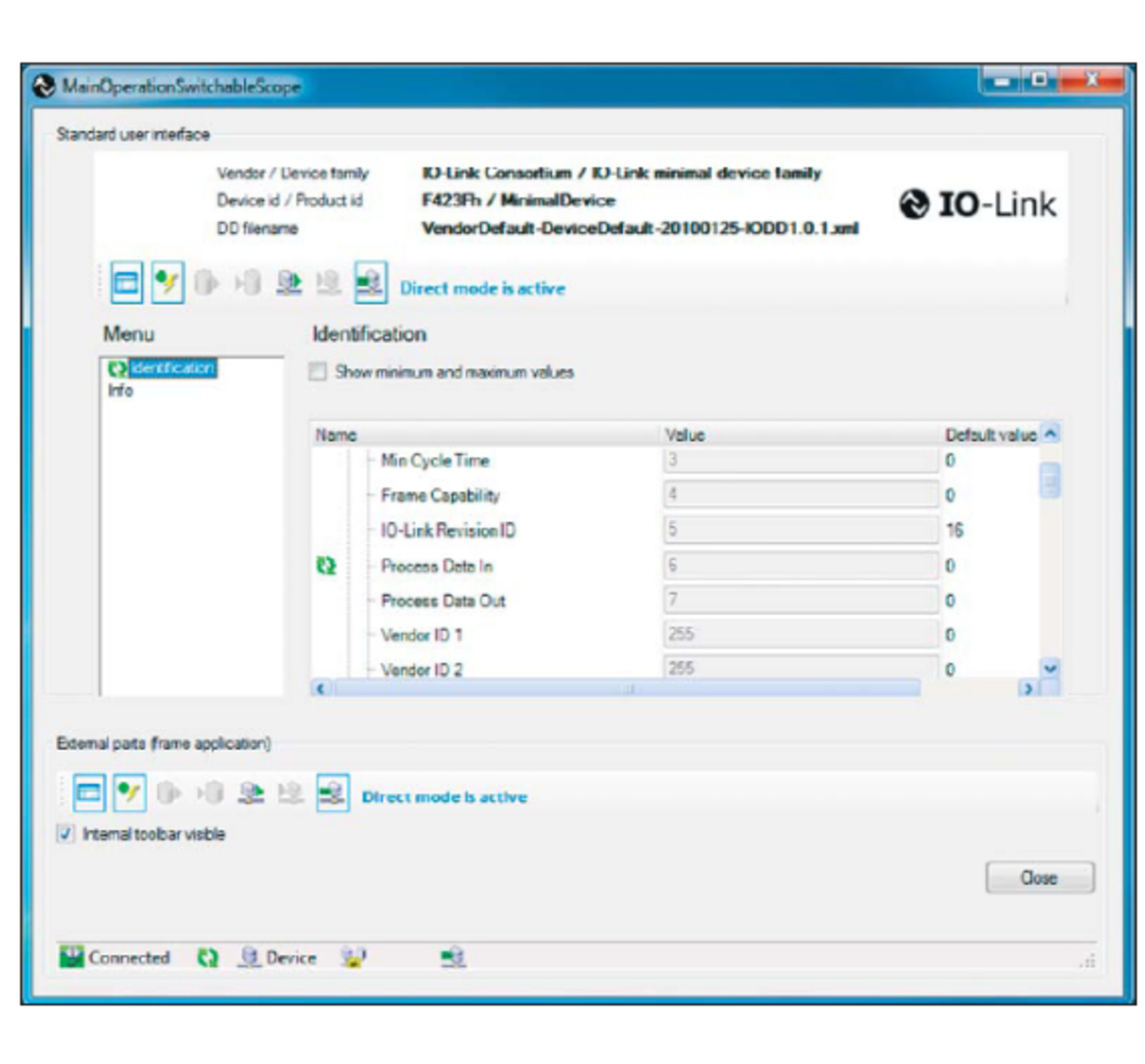 Ein Rahmenfenster (Bild 8) demonstriert dabei die Einbettung und Konfigurierbarkeit der Standard-Benutzeroberflächen. Es veranschaulicht die Nutzung herstellerspezifischer Anteile, z.B. Toolbar oder Statusbar, im Zusammenspiel mit den Standard-Benutzeroberflächen. So ist beispielsweise die in die Standard-Benutzeroberflächen integrierte Statusbar ausgeblendet und durch die herstellerspezifische ersetzt. Das Rahmenfenster verdeutlicht dies als „externe“ Bereiche. Zur Präsentation der gesamten Sensor- oder Aktor-Funktionalität wird der so genannte Modus „MainOperation“ verwendet. Die Auswahl der Funktion wie Identifikation, Parametrierung oder Beobachtung von IO-Daten erfolgt dann über einen Navigationsbereich innerhalb der Standard- Benutzeroberflächen.