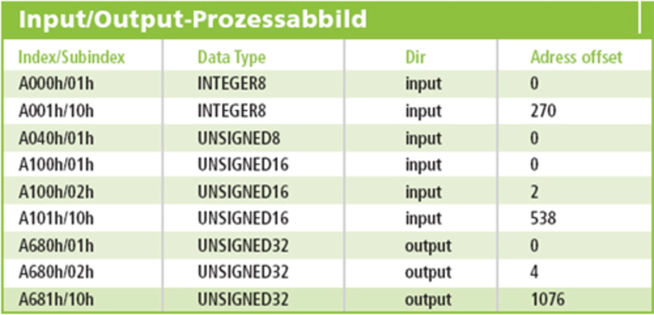 Der Austausch von Prozessdaten läuft über das Prozessabbild, das auf einen gemeinsamen Speicher beider Stacks zurückgreift. Auf Grundlage der Netzwerk-Variablen, wie sie in den Spezifikationen CiA302 und CiA405 definiert sind, können die RxPDOs (eingehenden Prozessdaten) flexibel auf die TxPDOs (ausgehenden Prozessdaten) abgebildet werden. Innerhalb des Speicherbereiches A000h bis A8FFh verweist jeder Objekteintrag mit festgelegtem Index mittels Datentyp-Definition und Address-Offset auf einen bestimmten Speicherbereich im Input- beziehungsweise Output-Prozessabbild.
