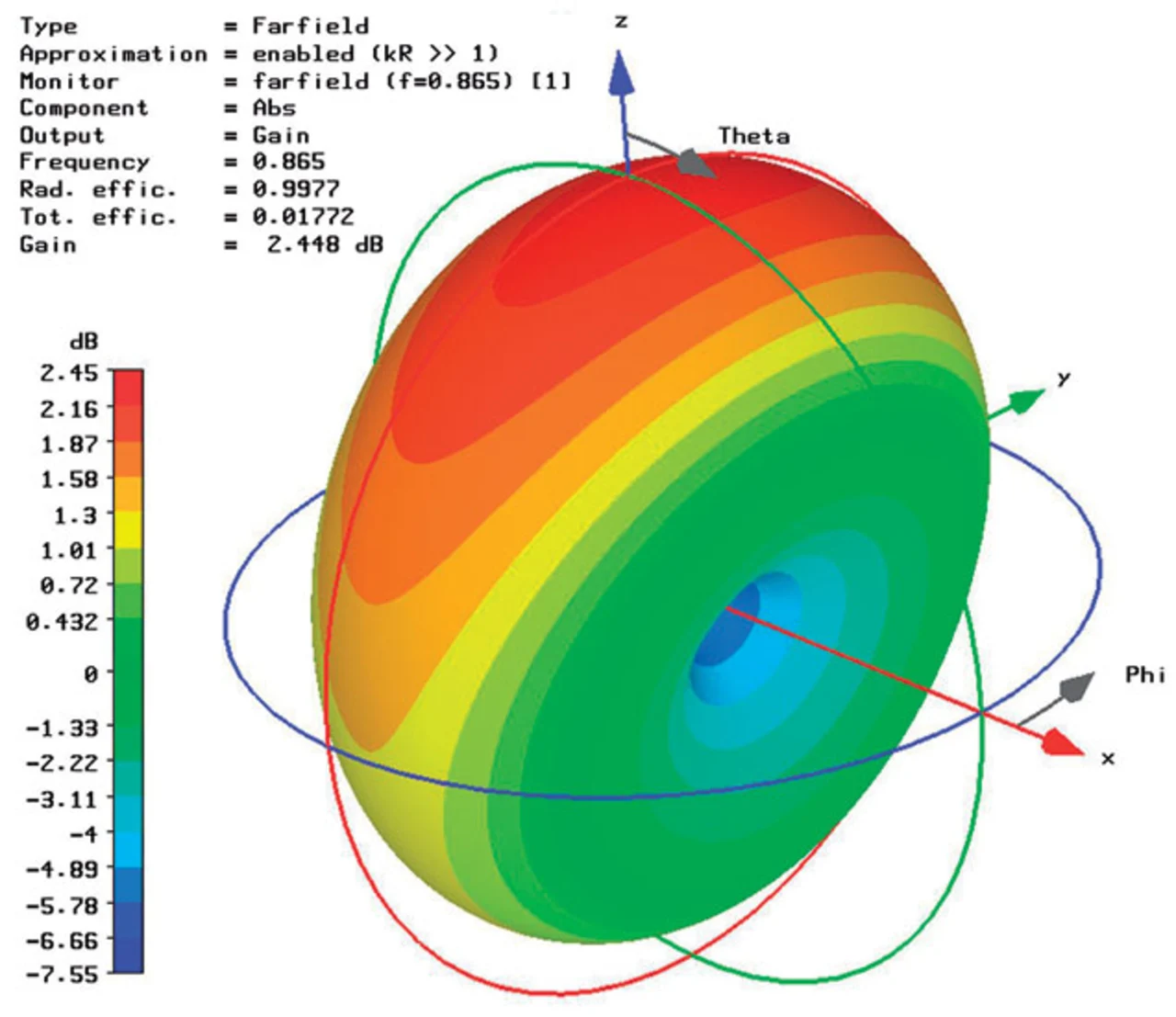 Der Wirkungsgrad der Antenne setzt sich aus den ohmschen und dielektrischen Verlusten und den Verlusten aus der Impedanztransformation zwischen Antennenfußpunkt und Chip-Impedanz zusammen. Hinzu kommt die verminderte Strahlungseffizienz durch die Verkürzung auf 1/6 gegenüber der freien Wellenlänge hinzu. Mit resultierenden Antennengewinnen von über –4 dBi und einer maximalen Strahlungsleistung des Lesegerätes von 2 W ERP (in Europa) lassen sich Entfernungen von mehr als 5 m überbrücken.