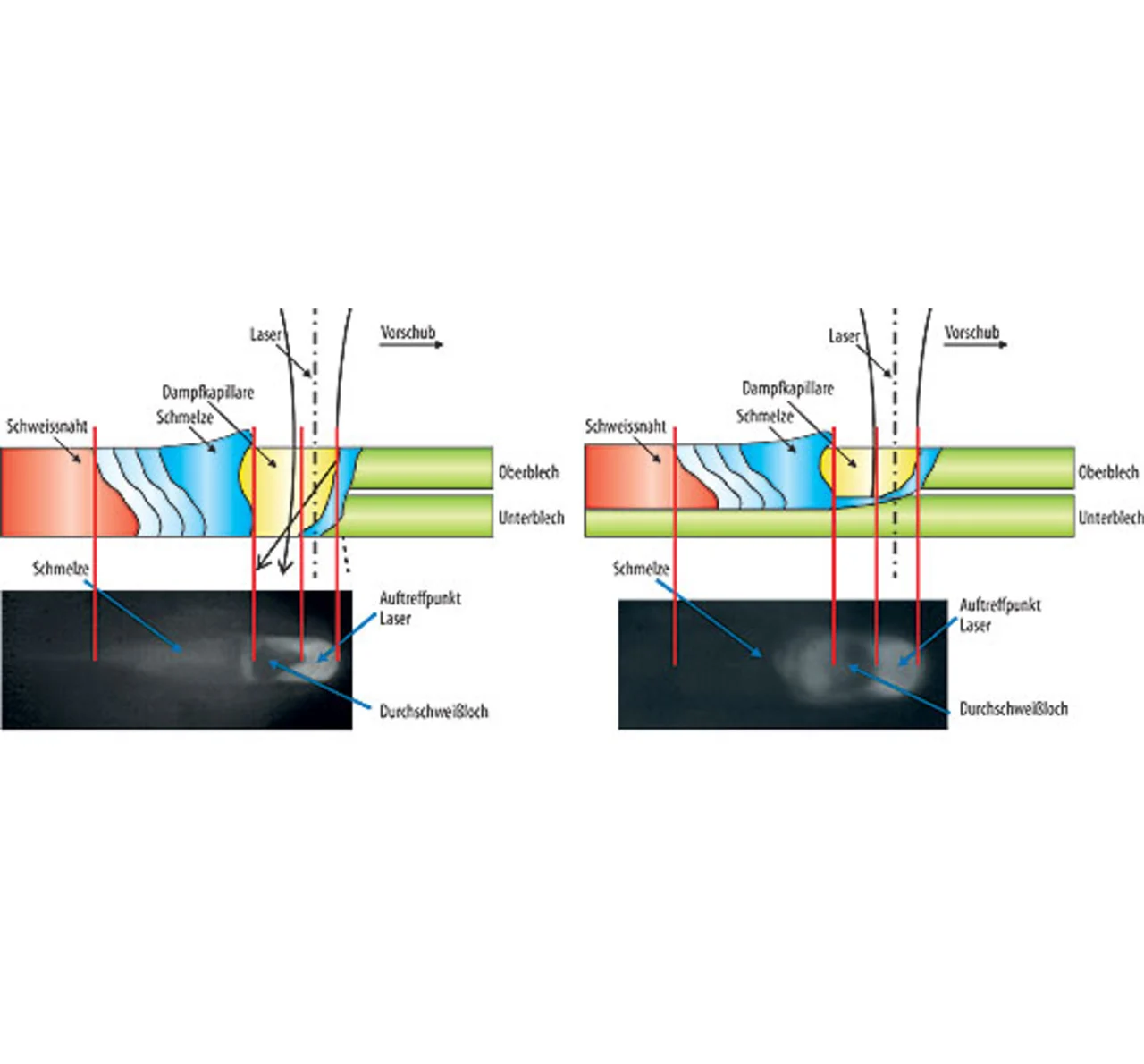 Laser-Schweißen ist weit verbreitet, vor allem im Automobilbau. Die beiden zu verbindenden Bleche werden aufeinander gelegt und ein auf wenige Zehntel-Millimeter fokussierter Strahl mit einer Leistung von einigen Kilowatt fährt entlang einer Linie. Das Material wird kurz aufgeschmolzen und erstarrt wieder. Die Tiefe des für einen kurzen Moment entstehenden Loches steigt mit der Laserleistung. Ist diese zu niedrig, dann ist die Verschweißung unvollständig und nicht haltbar. Ist sie andererseits zu hoch, dann entsteht ein Durchschweißloch auf der gegenüberliegenden Seite. Hier kann das Blech nicht sofort überlackiert werden, sondern es braucht erst eine Nachbehandlung. Bei verzinktem Blech verdampft das Zink an dieser Stelle und es entsteht Rostgefahr.
