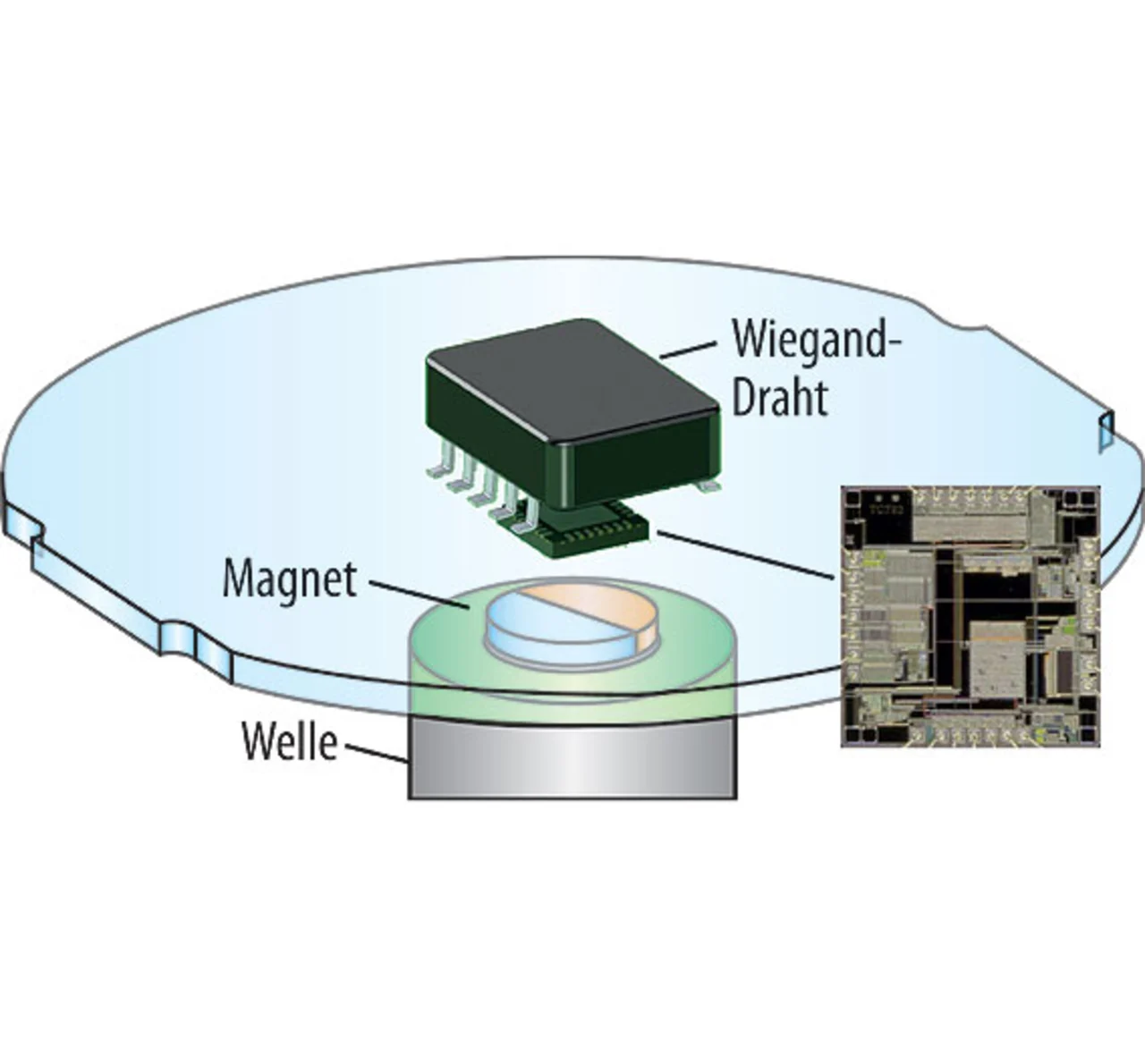 Die zentrale Systemkomponente ist ein ca. 10 mm langer Wiegand-Draht - ein ferromagnetisches Bauelement aus einer speziellen Kobalt-Eisen-Vanadium-Legierung mit einem Durchmesser von typisch 250 µm. Das Rohmaterial wird mehrfach unter Zug kaltverformt, bis die benötigte Dicke erreicht ist, und anschließend getempert. So entsteht ein Draht mit einem weichmagnetischen Kern und einem hartmagnetischen Mantel. Wirkt auf diesen ein äußeres Magnetfeld mit einer ausreichenden Feldstärke und geeigneter Richtung ein, so klappt die innere Magnetisierung sprunghaft um. Ist der Wiegand-Draht mit einer Wicklung aus Kupferdraht umgeben, dann wird in diese ein kurzer Spannungsstoß induziert. Dessen Höhe und Dauer sind in erster Näherung nur von der Modulgeometrie und der angeschlossenen Last, aber nicht von der Änderungsrate des externen Magnetfelds abhängig. Bei geeigneter Auslegung liefert er so viel Energie, dass er nicht nur als Sensorsignal dienen kann, sondern auch die für das Zählen und Speichern der Messsignale benötigte elektrische Energie erzeugt. Die Quelle ist allein die kinetische Energie des Antriebs (Bild 2). Wegen der schlagartig umklappenden Magnetisierung funktioniert das Prinzip auch bei langsamen Änderungen des externen Magnetfelds.