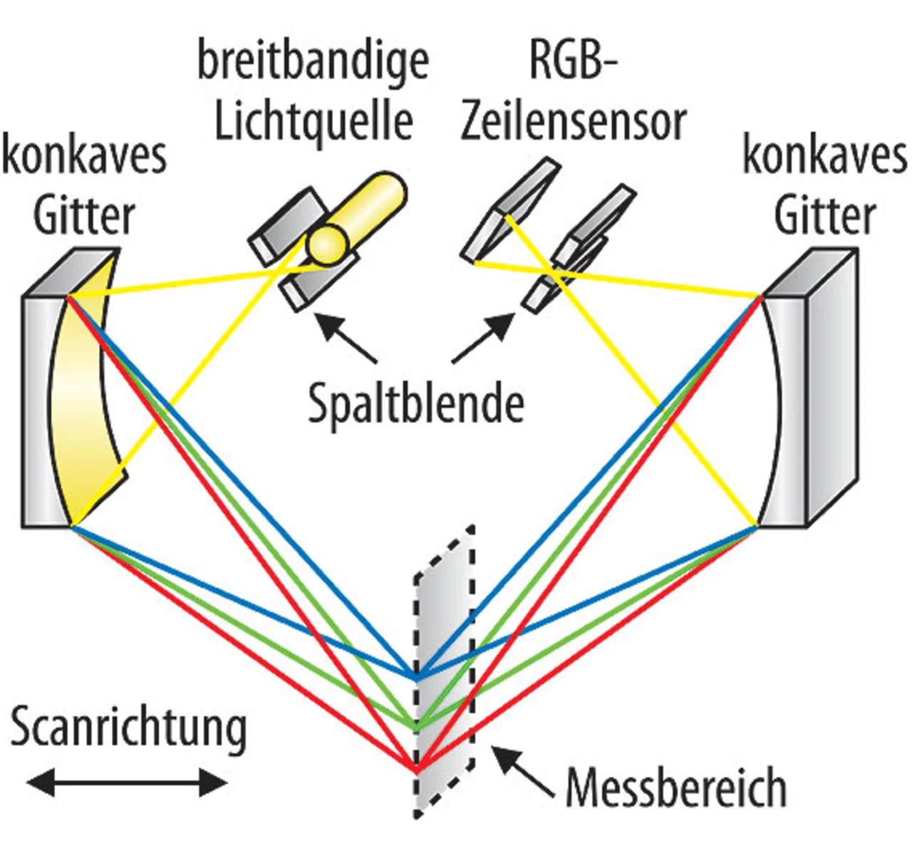 Das Licht einer breitbandigen Lichtquelle trifft durch einen Spalt auf ein reflektierendes konkaves Gitter, wie es derzeit in Spektrometern verbaut wird. Dieses Gitter vereint zwei Funktionen in einem optischen Element: Zum einen spaltet es das Licht in seine spektralen Bestandteile auf, zum anderen wirkt es fokussierend. Das hat den Effekt, dass jede Wellenlänge einen separaten Fokuspunkt besitzt, wobei alle Fokuspunkte in einer vertikalen Ebene angeordnet sind (Triangulationsprinzip). Die Abbildungsoptik ist spiegelsymmetrisch aufgebaut, so dass jeder Fokuspunkt auf eine weitere Spaltblende abgebildet wird (Konfokalprinzip). Wenn jetzt eine Oberfläche den Messbereich schneidet, wird eine bestimmte Wellenlänge gerade auf ihr fokussiert, alle anderen haben ihre Brennpunkte höher oder tiefer. Das hat zur Folge, dass nur dieses Licht den RGB-Sensor erreicht. Die Spaltblende davor verhindert, dass auch andere Wellenlängen durchkommen. So erhält der RGB-Sensor praktisch monochromatisches Licht, dessen jeweilige Farbe hochempfindlich von der Höhe des untersuchten Objekts abhängt. Mittels einer speziellen Farbtransformation lässt sich die Messempfindlichkeit dann noch wesentlich steigern.