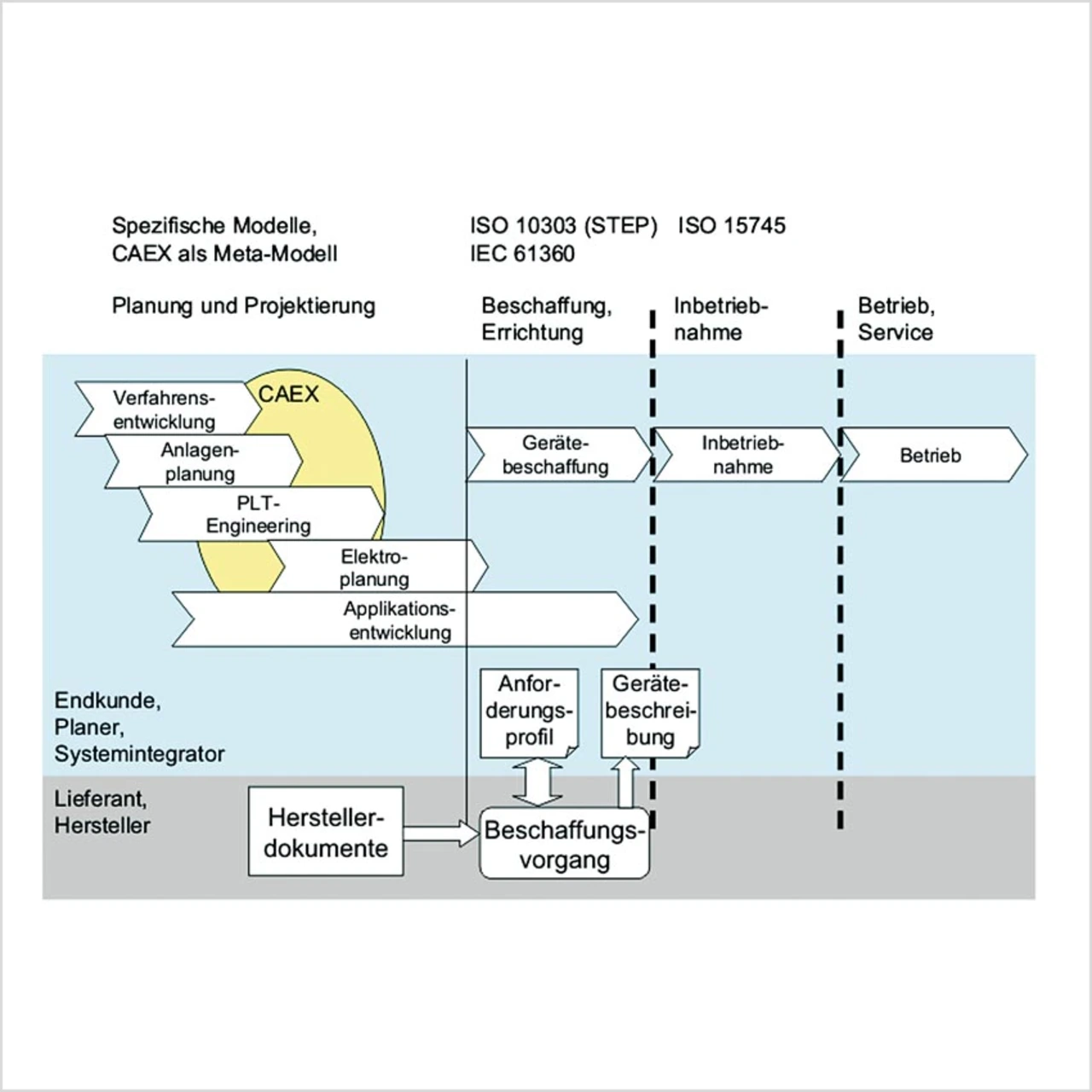 Ein Anbieter schickt daraufhin in seinem Antwortdokument eine gleichermaßen formalisierte Beschreibung der Eigenschaften des angebotenen Gerätes. Besteht Durchgängigkeit in den Informationsmodellen, so kann der Systemintegrator diese Daten direkt in sein CAE-System einlesen und mit den technischen Anforderungen vergleichen. Üblicherweise befinden sich im Lieferumfang der Geräte detaillierte Dokumentationen sowie Gerätebeschreibungen, die den aus der Planung stammenden Informationsbestand anreichern. Diese werden in den weiteren Phasen des Lifecycle mit verwendet.