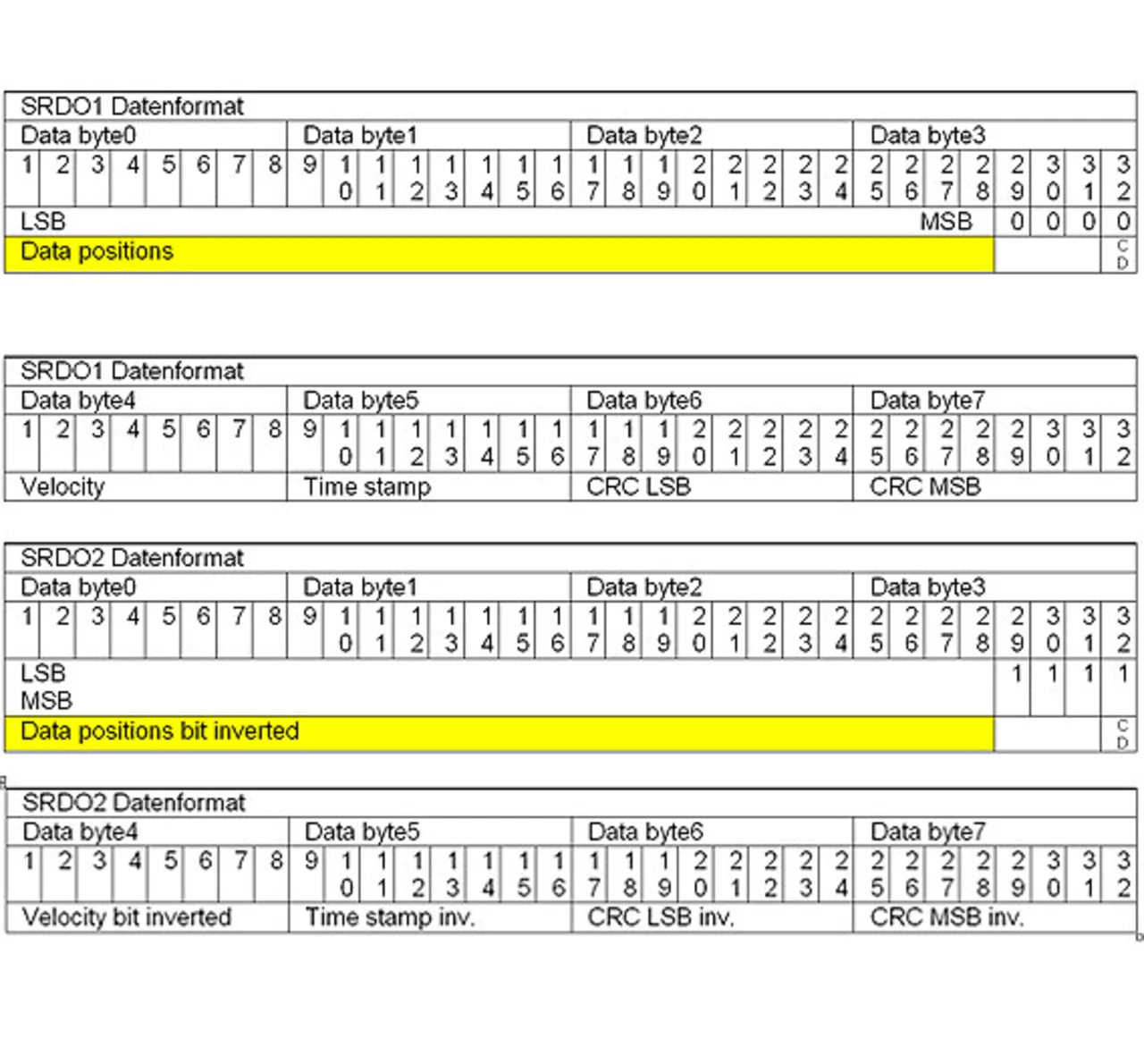 Der prinzipielle Aufbau erlaubt, Anwenderwünsche umzusetzen. Das beinhaltet z.B. ein Geschwindigkeitssignal, welches die Digits bezogen auf eine Torzeit (parametrierbar – 16 Bit) generiert, davon ein Beschleunigungssignal ableitet, ein zusätzlicher Zeitstempel, CRC-Berechnungen für die Bewertung der Übertragung vom Codierer zum Master uvm. Als Beispiel ist im Bild 4 ein spezifisches Datenformat für SRDOs dargestellt.
