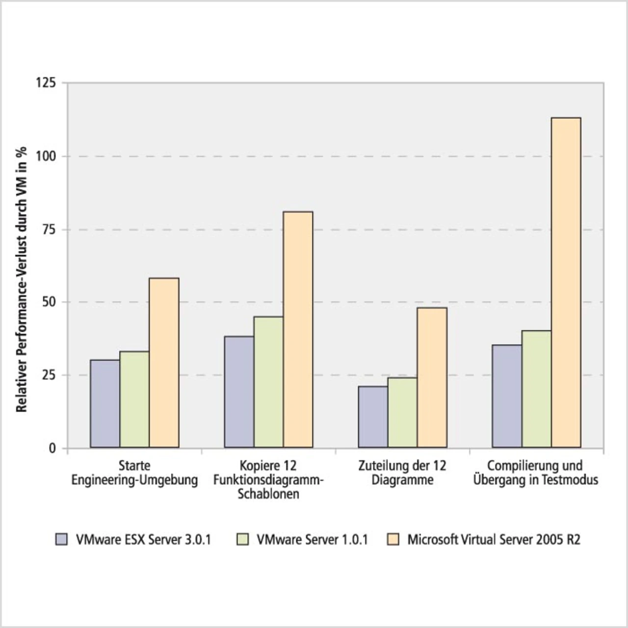 Der Performance-Verlust durch Virtualisierung ist je nach Virtualisierungstool unterschiedlich und wird von den Tool-Herstellern in einer Größenordnung zwischen 5 und 30 % angegeben. In praxisnahen Tests am ABB Forschungszentrum in Ladenburg wurden noch größere Unterschiede zwischen verschiedenen Virtualisierungstools festgestellt: Untersucht wurde die Performance der VMs von VMware ESX Server 3.0.1, VMware Server 1.0.1 und Microsoft Virtual Server 2005 R2. Die Messungen mit einer „Out-of-the-Box“-Installation (automatische Installation) der drei virtuellen Maschinen wurden auf identischer Hardware durchgeführt: einem IBM xSeries 346-Server mit zwei Intel Xeon-3.6-GHz-Prozessoren und 4 GByte RAM. Innerhalb der VMs wurde jeweils der gleiche Engineering-Arbeitsplatz des ABB-Leitsystems „System 800xA“ installiert. Für die Messungen wurde dann ein Testskript mit einer Serie von Engineering-Vorgängen abgearbeitet. Die Mess-Ergebnisse zeigen den relativen Performance-Verlust durch die VMs.