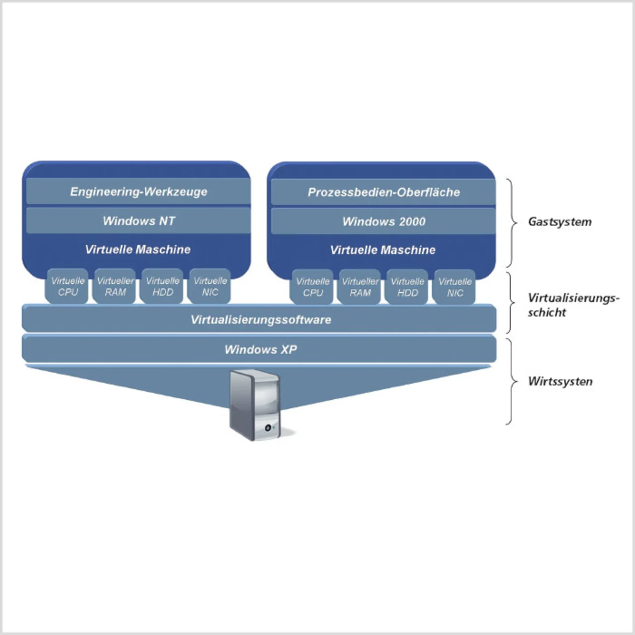 Durch die Überalterung integrierter Fremdprodukte besteht eigentlich die Notwendigkeit, Leitsysteme auf aktuellere Produkte zu migrieren. Nun ist eine Migration aber auch mit zusätzlichen Lebenszyklus-Kosten verbunden. Solange Anlagenbetreiber keinen zusätzlichen Nutzen durch die Migration erkennen, sind sie daran interessiert, die bestehende Systemkonfiguration weiter zu verwenden. Daher sind in vielen Anlagen nach wie vor längst abgekündigte Betriebssysteme wie Windows NT oder Windows 2000 im Einsatz. Fällt jedoch eine Hardware-Komponente aus, kann dies zu Ersatzteil-Problemen führen, da sich die veralteten Betriebssysteme selten auf aktueller PC-Hardware ausführen lassen. Eine der häufigsten Ursachen dafür ist, dass Hardware-Hersteller für neuere Komponenten keine Treiber mehr für die abgekündigten Betriebssysteme bereitstellen. Eine interessante Möglichkeit zur Reduzierung der daraus resultierenden Abhängigkeit zwischen Hardware und Software bietet die Virtualisierung.