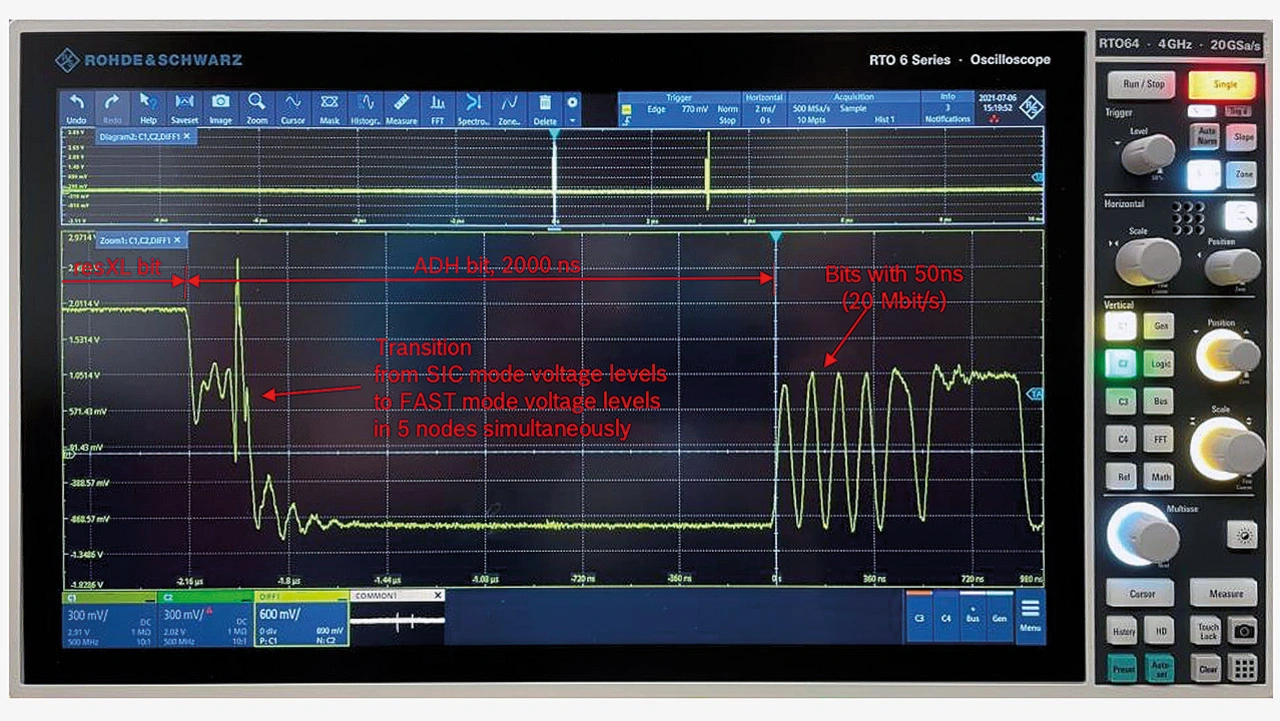 Bezüglich der physikalischen Übertragung zwischen CAN-Controller und CAN-Transceiver kann der Anwender die übliche NRZ-Codierung (Non Return to Zero) oder die neue PWM-Codierung (Pulse-Width Modulation) verwenden. Mit der PWM-Codierung sind höhere Bitraten in der Datenphase erreichbar. Unter Laborbedingungen wurden 20 Mbit/s erzielt. Um den Anwendern das Evaluieren bezüglich des »Ringings« auf den Netzwerkleitungen zu vereinfachen, erfolgt die Umschaltung von der langsamen Arbitrierungsphase (maximal 1 Mbit/s) zur schnellen Dataphase (10 Mbit/s und mehr) in zwei Schritten (zuerst von TxD dominant zu Level-0 und wenn das differenzielle Signal stabil ist zu Level-1). Die beiden Spannungshübe sind so geringer und führen so zu weniger Überschwingern. Das gleiche gilt für das Abbremsen am Ende des CAN-XL-Rahmentelegramms (zuerst von Level-1 zu aktiv rezessivem Netzwerksignal und dann zu dominantem Signal).