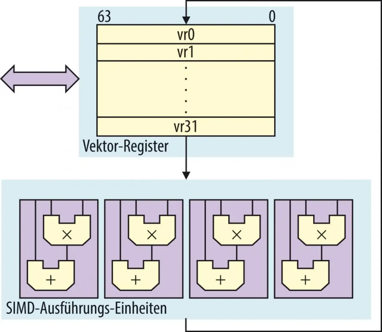 SIMD steht für Single Instruction Multiple Data, also die Verarbeitung mehrerer Operanden mit einem Befehl. Damit eignet sich diese Einheit insbesondere für die digitale Signalverarbeitung, die in der Regel einfache Grundoperationen wie Multiplizieren und Aufaddieren benötigt, diese aber sehr häufig und schnell ausführen muss. Wie das vereinfachte Blockdiagramm in Bild 2 zeigt, hat die SIMD-Einheit Zugriff auf 32 eigene und nicht anderweitig verwendete 64‑bit-Vektorregister. Sie bearbeitet mit einem Befehl 64 bit breite Vektoren, die in zwei 32‑bit- oder vier 16‑bit-Daten aufgeteilt sind.
