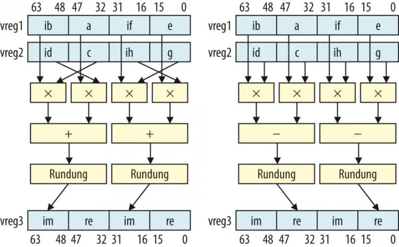Die beiden Eingangsvektoren in vreg1 und vreg2 werden als komplexe Zahlen mit einem 16-bit-Real- und einem 16-bit-Imaginärteil aufgefasst. Nach den Rechenregeln komplexer Arithmetik werden jeweils zwei dieser Zahlen miteinander multipliziert, gerundet und das Ergebnis in vreg3 gespeichert.
