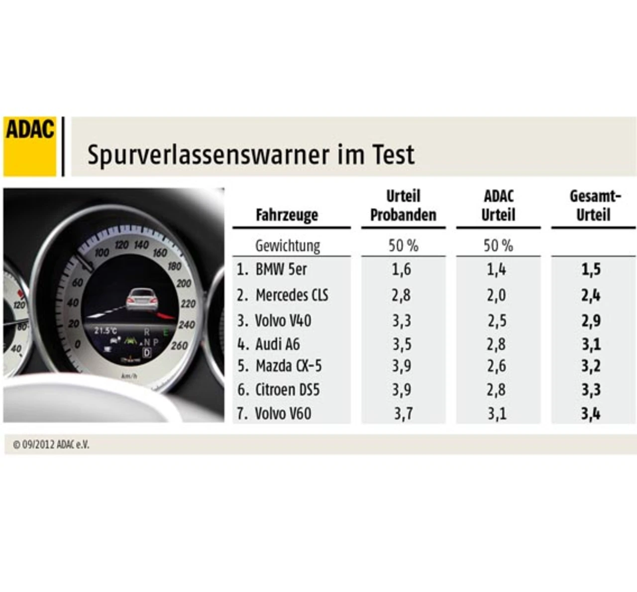 Getestet wurden die Spurverlassenswarner beim Audi A6, BMW 5er, Citroën DS5, Mazda CX-5, Mercedes CLS sowie Volvo V40 und V60. Am besten abgeschnitten hat der BMW 5er; hier vibriert der Lenker rechtzeitig, auch bei schlechten Markierungen, und in der richtigen Intensität. Den Warnungen im Mazda, Citroën und Volvo V60 erteilten die normalen Autofahrer nur die Note vier - Alarme wie akustische Geräusche oder die Sitzvibration wurden als eher störend empfunden. Das darf laut ADAC nicht sein: Warnungen, die so nervend sind, dass der Fahrer das System lieber abschaltet.