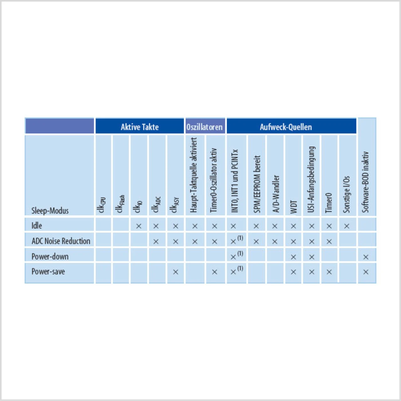 Als Alternative dazu kann auch der Silent-Modus ausgewählt werden, bei dem LIN-Transceiver und Watchdog abgeschaltet sind, der Spannungsregler aber aktiv bleibt. Dadurch kann der Mikrocontroller weiterhin alle notwendigen Funktionen ausführen. Der Strombedarf des SBC im Silent-Modus liegt typischerweise bei 57 μA. Um unter der 100-μA-Grenze für das Gesamtbauteil zu bleiben, muss auch die Stromaufnahme des Mikrocontrollers reduziert werden. Zu diesem Zweck gibt es im ATtiny167 vier verschiedene Stromsparmodi, die jeweils unterschiedliche Module des Mikrocontrollers abschalten (Tabelle):