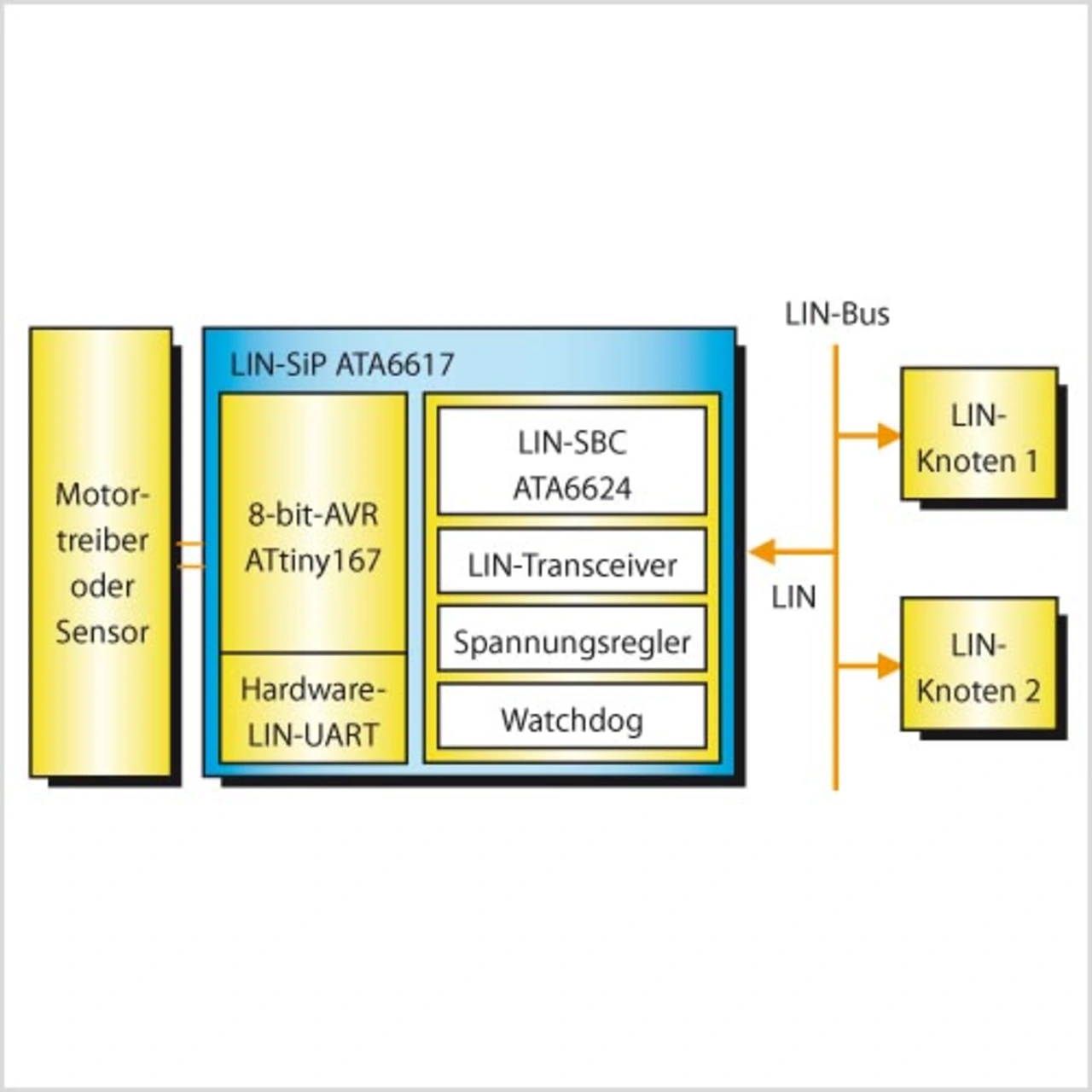 Neben dem ATA6624 ist im neuen SiP der AVR-Mikrocontroller ATtiny167 integriert, der speziell für Automotive-LIN-Anwendungen entwickelt wurde. Der ATtiny167 enthält 16 Kbyte Flash-Speicher und jeweils 512 byte SRAM bzw. EEPROM.