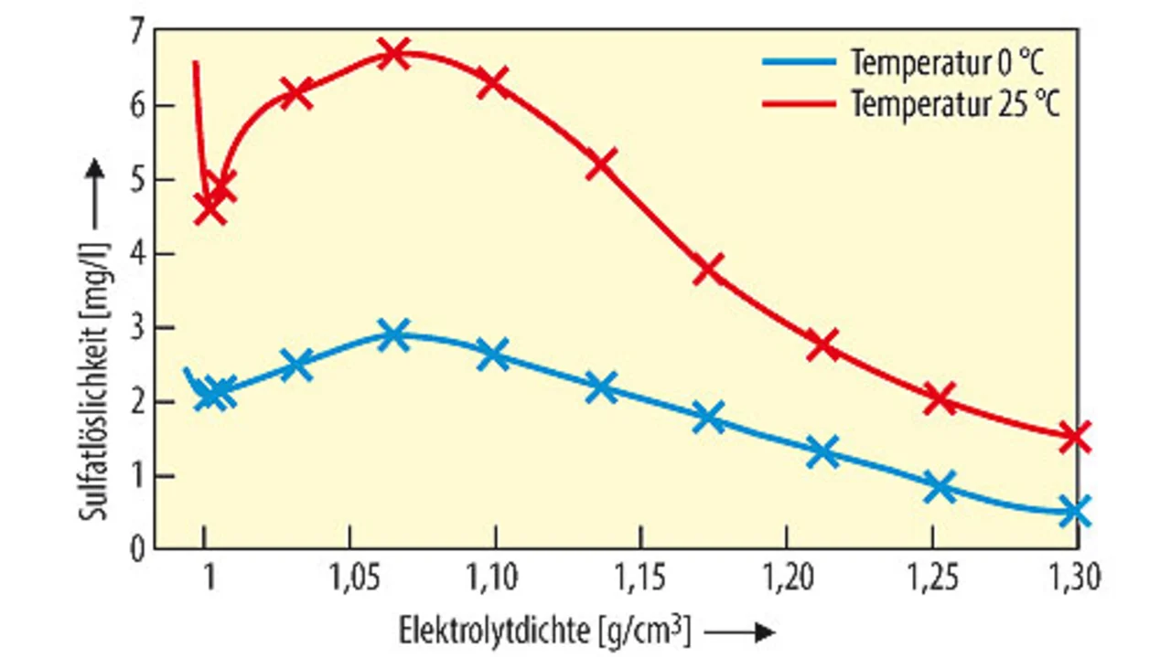 Die Säuredichte bei Starterbatterien variiert zwischen dem Zustand „leer“ mit 1,10 g/cm3 und „voll“ mit 1,28 g/cm3. In diesem Bereich nimmt die Löslichkeit des Bleisulfats mit sinkender Säuredichte zu (Bild 7). Bei hoher Sulfatlöslichkeit kommt aber Bleisulfat nicht nur an der Elektrode selbst vor, sondern kann in gelöster Form sogar bis zum Separator wandern. Bei einer erneuten Ladung werden die gelösten Bleisulfatteilchen dort in Pb bzw. PbO2 umgewandelt und können hier einen Kurzschluss verursachen, indem sie sich in Form von Dendriten anordnen. Ein Dendrit ist in diesem Fall das nadelförmige Wachsen von Pb bzw. PbO2.
