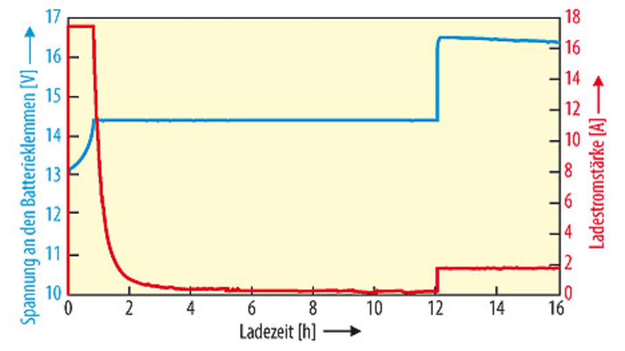Erst nach Anwendung der IUIa-Methode, wie in Bild 12 dargestellt, konnte die volle Kapazität des 70-Ah-Akkus wieder erreicht werden, d.h. mit Hilfe der IUIa-Methode ist eine Vollladung möglich. Allerdings werden dabei, wie aus Bild 12 ersichtlich, bordnetzfeindliche Spannungen von 16,5 V erreicht, so dass ein solches Laderegime im Fahrzeug nicht ohne weiteres realisierbar ist. Zur Wiederherstellung von stark sulfatierten Starterbatterien sind Ladefaktoren von 1,5 bis 2 keine Seltenheit und dies unter Umständen über mehrere Zyklen hinweg.