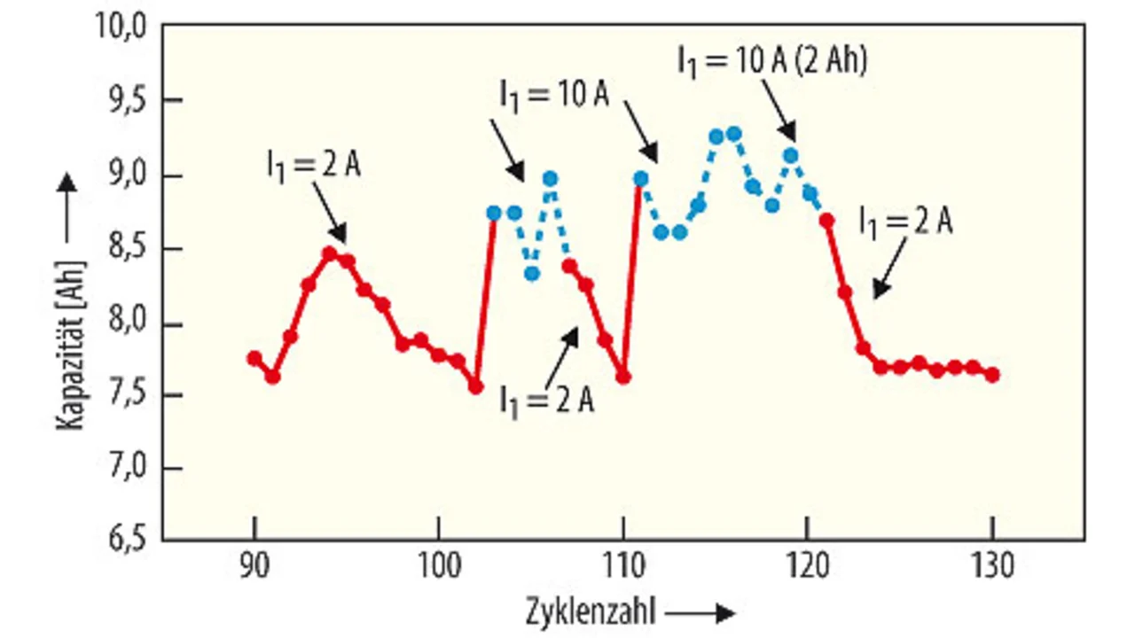 Welchen Einfluss kleine Entladeströme auf die Wiederaufladefähigkeit verschlossener Bleistarterbatterien haben, zeigt Bild 11. Die Kapazität ist nach wenigen C/20- und einer C/100-Entladung gegenüber dem Neuzustand um fast 30 % eingebrochen. Anschließende Versuche, mit Standard-IU-Kennlinien eine Vollladung herzustellen, schlugen allesamt fehl; die Entladekapazität blieb bei ca. 50 Ah stehen.