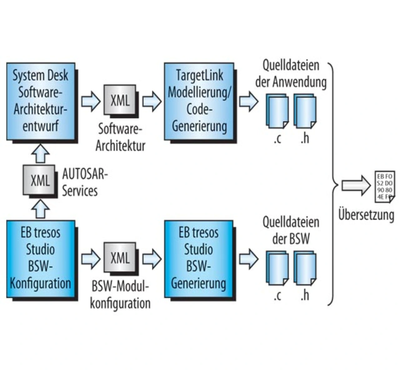 Im weiteren Verlauf werden die Parameter aller weiteren Basis-Software-Module durch den Integrator in EB tresos Studio – teilweise automatisiert – konfiguriert. Die anschließende Code-Generierung in EB tresos Studio führt zum vollständigen Quell-Code für die AUTOSAR-Basis-Software, welche zusammen mit dem Quell-Code für die Anwendungskomponenten aus TargetLink der Build-Umgebung zugeführt wird. Ergebnis ist schließlich der ausführbare Binär-Code, mit welchem das Steuergerät programmiert wird.