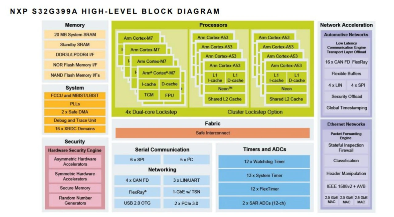 Die Prozessoren der S32G3-Familie sind mit bis zu acht Corex-A53-Cores mit Neon-Technologie ausgestattet, die in zwei Clustern zu je vier Cores organisiert sind, mit optionalem Cluster-Lockstep für Anwendungen und Dienste. Dazu kommen noch bis zu vier Cortex-M7-DCLS-Komplexe (DCLS: Dual-Core Lockstep) für Echtzeitanwendungen. NXP hat die Prozessoren außerdem mit bis zu 20 MB On-Chip-SRAM ausgestattet. Darüber hinaus sind auch eine LLCE (Low Latency Communication Engine) für den Datentransfer in Fahrzeugnetzen und eine PFE (Packet Forwarding Engine) für Ethernet-Netze mit drei Ports mit jeweils 2,5 Gbit/s integriert. Eine HSE (Hardware Security Engine) sorgt für sicheres Booten und beschleunigt Security-Dienste. Dazu kommen noch 16 Isolationsbereich mit einem XRDC (eXtended Resource Domain Controler), der die Zugriffskontrolle, den Schutz des Systemspeichers und die Isolierung der Peripherals übernimmt. Die Bausteine sind außerdem mit fortschrittlicher Safety-Hardware und der dazugehörigen Software versehen, so dass ASIL-D kein Problem ist. An Schnittstellen sind bis zu 20 CAN/CAN-FD-Interfaces, plus LIN und FlexRay integriert. Dazu kommen noch eine 1-Gigabit-Ethernet- und drei 2,5-Gigabit-Ethernet-Schnittstellen und zwei PCIe-Gen3-Interfaces (2 Lanes).