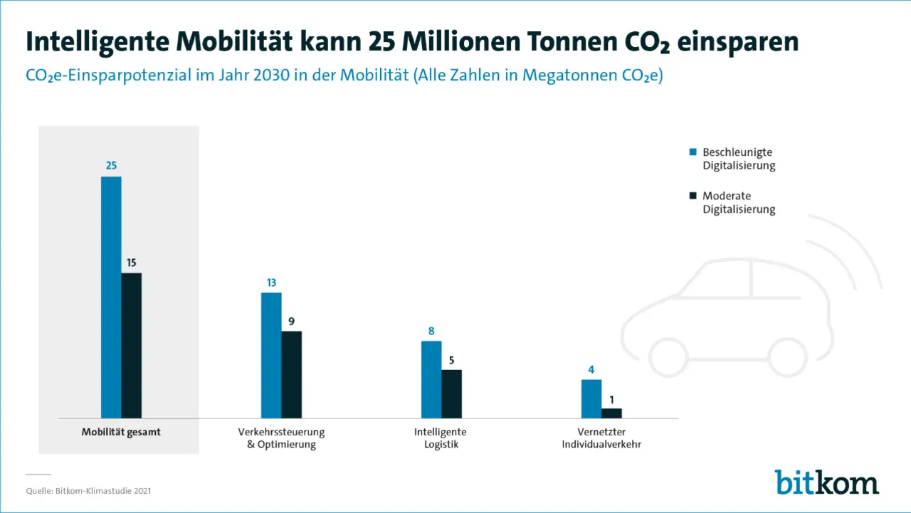 Allein in der Mobilität kann Deutschland bis 2030 mit beschleunigter Digitalisierung sieben Prozent der insgesamt geplanten CO2-Einsparung erreichen, so das Ergebnis der Bitkom-Studie »Klimaeffekte der Digitalisierung«. Untersucht wurde dabei das CO2-Einsparpotenzial verschiedener digitaler Technologien in sieben unterschiedlichen Bereichen: Fertigung, Mobilität, Energie, Gebäude, Arbeit und Business, Landwirtschaft und Gesundheit. Die Studie berücksichtigte dabei auch den eigenen CO2-Fußabdruck der Digitalisierung.