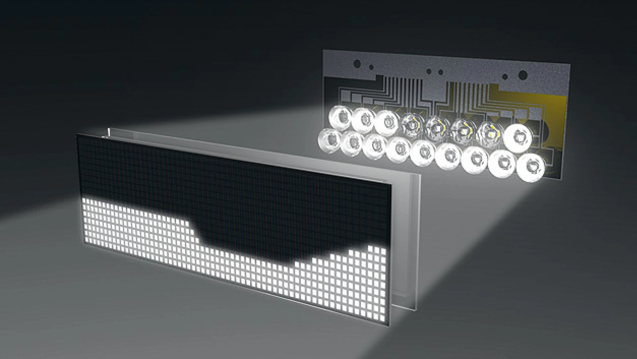 Im Gegensatz zu einem herkömmlichen Scheinwerfer, bei dem eine Linse oder ein Reflektor das einfallende Licht bündelt und in die gewünschte Richtung lenkt, wird beim hochauflösenden Scheinwerfer die Lichtverteilung primär durch die Software-Ansteuerung einzelner Pixel bestimmt. Die Rolle des herkömmlichen Reflektors zur Lichtformung übernehmen mehrere hundert einzeln ansteuerbare Pixel. Durch die Digitalisierung der Lichtquelle wird die Lichtgestaltung flexibel; so können vorhandene Lichtfunktionen wie das blendfreie Fernlicht verbessert werden. Dynamische Lichtfunktionen wie die Leuchtweite-Regulierung oder das Kurvenlicht lassen sich durch Verschiebung der Hell-Dunkel-Grenze oder durch Anpassung der Lichtschwerpunkte frei von Mechanik realisieren. Beispielhafte Techniken sind LCD (Bild 5) [5][6], DLP [7] und μAFS [7]. Außerdem lassen sich neue Lichtfunktionen durch ein Software Update erweitern, ohne die Hardware eines Lichtmoduls anpassen zu müssen. Der hochauflösende Scheinwerfer gleicht mehr einem universellen Lichtgenerator und die charakteristischen Eigenschaften der Lichtverteilung werden durch die entsprechende Software bestimmt.