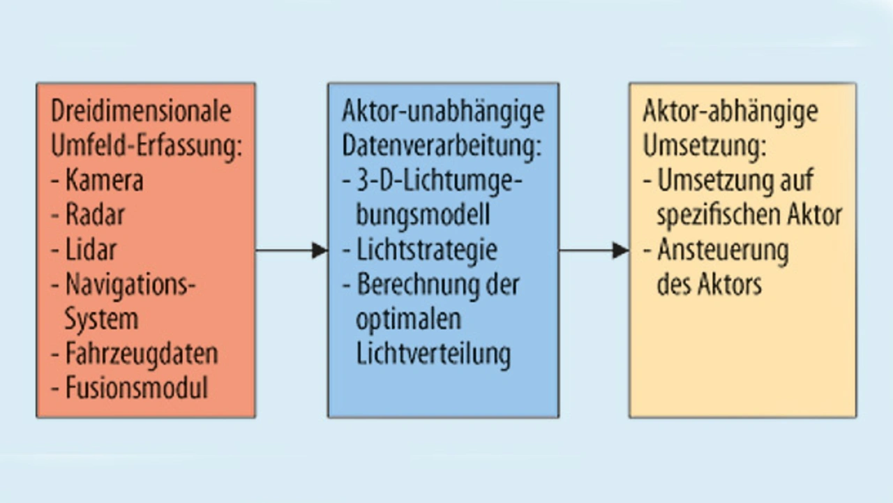 Durch den Trend hin zu hochauflösenden Scheinwerfersystemen ergeben sich für die Lichtelektronik neue Herausforderungen. In Bild 6 ist der beispielhafte Signalfluss eines Fahrzeugs mit einem hochauflösenden Scheinwerfer dargestellt. Wesentliche Bestandteile sind eine gute dreidimensionale Umfeld-Erfassung, eine Aktor-unabhängige Datenverarbeitung für die Lichtfunktion und die anschließende Aktor-abhängige Umsetzung der Daten für die HD-Lichtmodule.