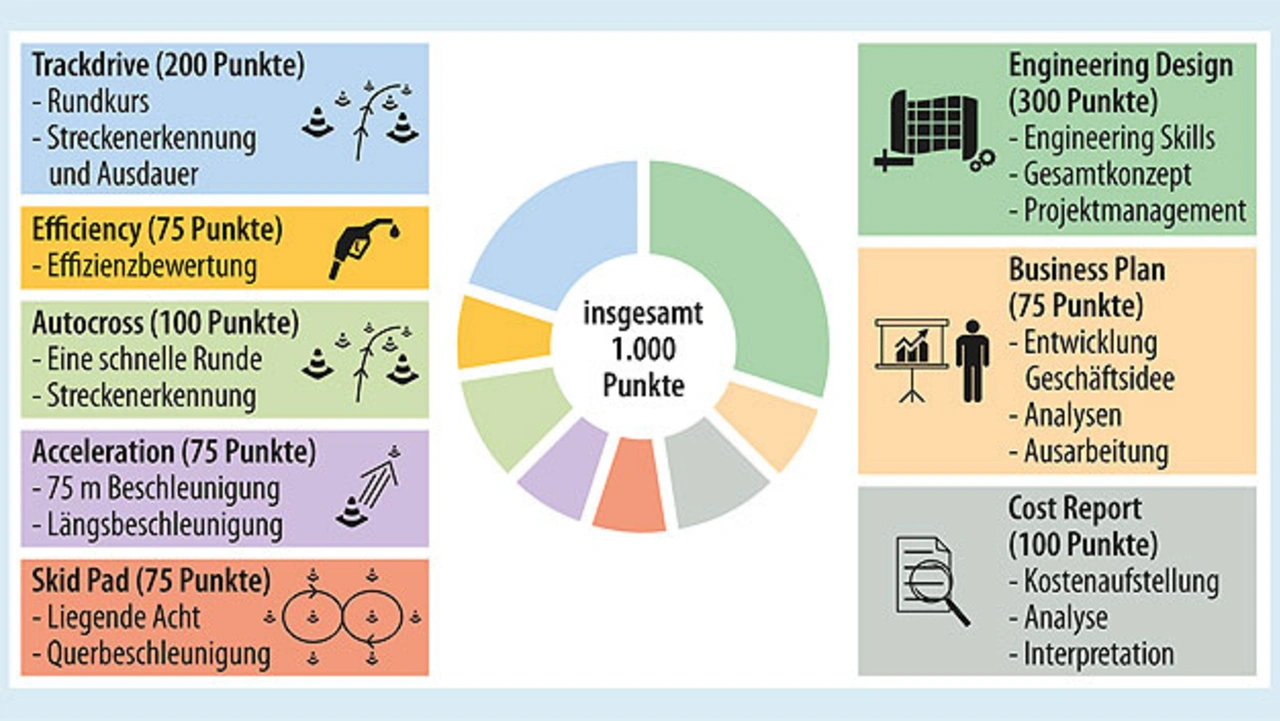 Darüber hinaus gibt es die sogenannten statischen Disziplinen. So wird beispielsweise im »Business Plan« eine fiktive Geschäftsidee entwickelt und vor potenziellen Investoren präsentiert. Im Bereich »Cost Report« wird das wirtschaftliche Verständnis der Teilnehmer geprüft, Make-or-buy-Entscheidungen getroffen und Produktionskosten verglichen. Durch den Mix aus dynamischen und statischen Bewertungen ist ein interdisziplinärer Zusammenschluss der Studierenden erforderlich: Ingenieure aus der Mechanik und der Elektrotechnik werden ebenso benötigt wie Wirtschaftsingenieure oder Business- und Mediastudenten.
