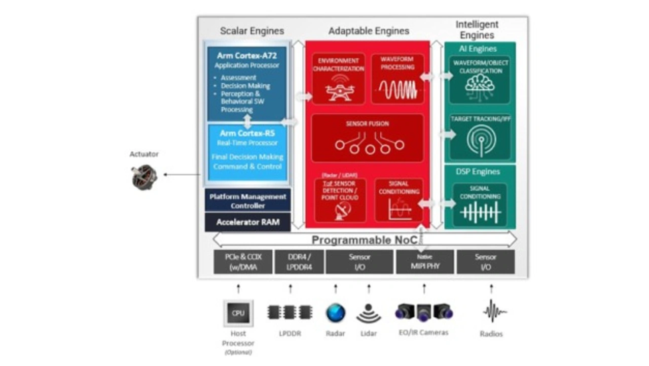 In Multimission- und situationsbewussten UAVs können die Entwickler die Adaptable-Engines für Aufgaben wie Sensorfusion oder Signalaufbereitung nutzen. Die Intelligent-Engines wiederum können für KI-Anwendungen mit geringer Leistungsaufnahme und niedriger Latenz sowie für die Signalaufbereitung für Navigation und Zielverfolgung eingesetzt werden, ebenso wie auf die Klassifizierung des Schwingungsverlaufs für »Cognitive RF« und »Spectrum Awareness«. Die Scalar-Engines übernehmen hingegen die Steuerung und Kontrolle und können im Lock-Step arbeiten, um Safety und Security zu gewährleisten.
