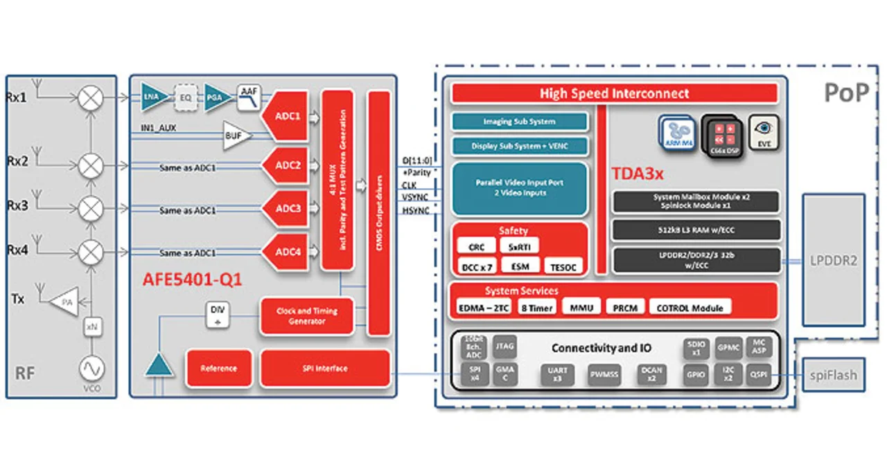 Die Cortex-M4-Cores eignen sich gut zum Konfigurieren der HF-Bauteile und des AFE5401-Q1 sowie zum Verwalten und Überwachen der Verarbeitungsabläufe der anderen Cores. Ebenso können sie die Objektinformationen nach außen kommunizieren. Der TDA3x bietet darüber hinaus eine Vielzahl an Schnittstellen, darunter Videoeingänge für den Empfang paralleler oder serieller CSI‑2-Daten vom Radar-Front-End, ein CAN-Controller, verschiedene serielle Schnittstellen und ein QSPI, das einen schnellen Quad-Lane-Boot-Prozess unterstützt. Die DDR-Schnittstelle kommt mit verschiedenen SDRAM-Typen zurecht und besitzt eine ECC-Ergänzung für die Fehlererkennung und -korrektur. Auch die internen Speicher des TDA3x sind mit ECC oder Parität geschützt. Abgesehen von einer Hardware-mäßigen BIST-Funktion (Built-In Self-Test – eingebauter Selbsttest für wichtige Funktionen des Chips) sind weitere Sicherheitsmerkmale der Safety-MCU-Familie Hercules TMS570 eingebaut. Hierdurch ist die TDA3x-Familie für sicherheitskritische Fahrerassistenzsysteme wie etwa Radar geeignet. Die Reihe TDA3xR ist mit zwei Gehäusevarianten verfügbar, nämlich mit Abmessungen von 15 × 15 mm2 oder 12 × 12 mm2, wobei es sich bei letzterer um die sogenannte POP-Variante (Package On Package) handelt. Durch die Anordnung des DDR-Speichers auf dem TDA3x lassen sich hier die Abmessungen des Sensors minimieren.