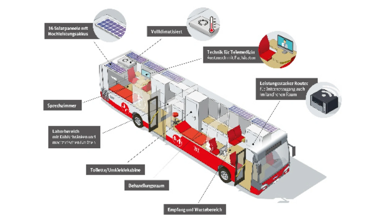 Der Medibus ist unterteilt in Wartezimmer, Labor und Behandlungsraum und Sprechzimmer. Durch Einsatz modernster Technik wie etwa einer internetfähigen Videokonferenzanlage besteht die Möglichkeit, bei der Behandlung auch Telemedizin einzusetzen. So kann die moderne medizinische Versorgung durch Fachärzte im ländlichen Raum sichergestellt werden – eine wertvolle Ergänzung zu den bestehenden Arztpraxen.