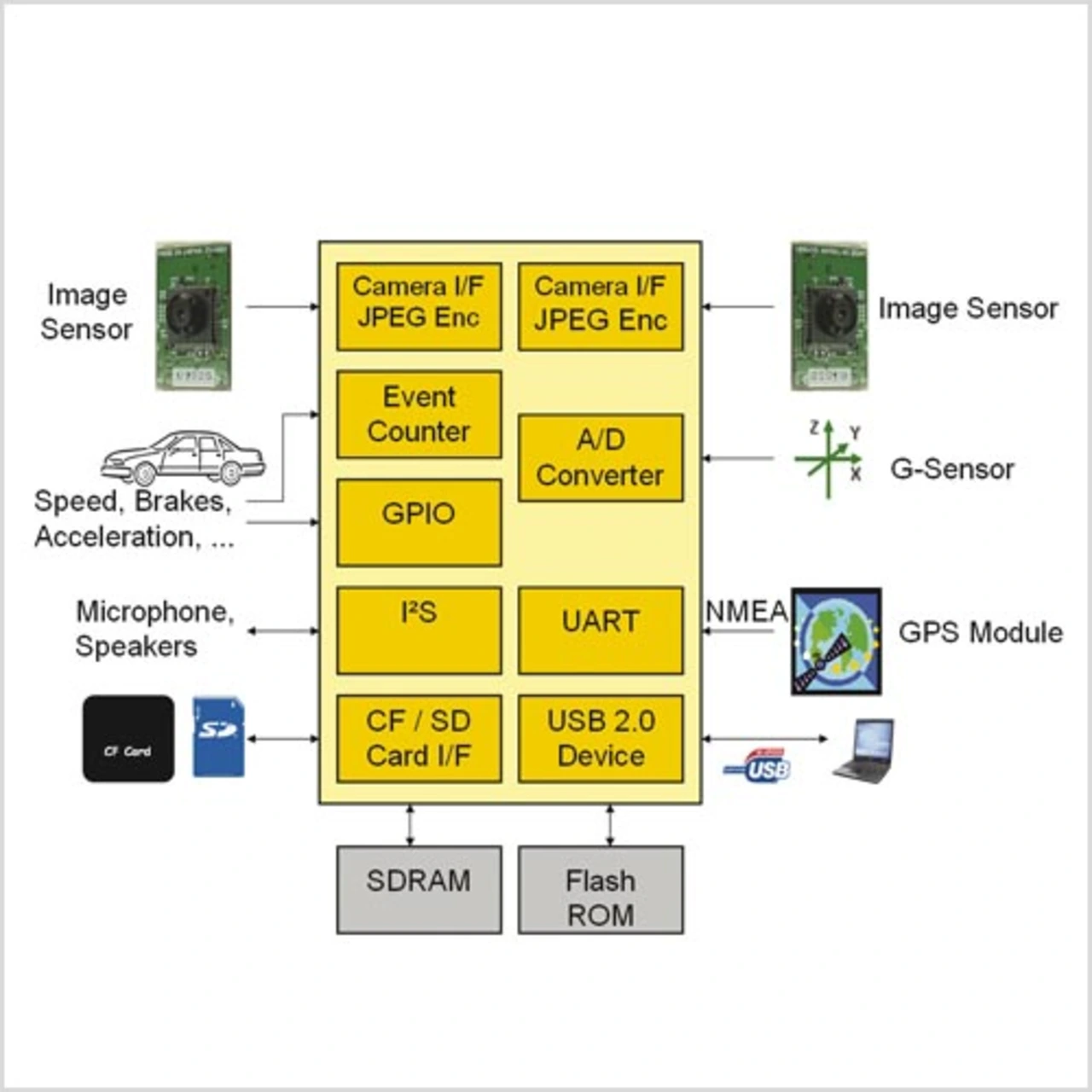 Seiko Epson hat jetzt einen Chip entwickelt, der auf die spezifischen Anforderungen von Drive-Recordern und Fahrzeugkamerasystemen zugeschnitten ist. Der »S2S65A00« bietet als Single-Chip-Lösung neben zwei Kameraeingängen mit Hardware-JPEG-Encodern alle weiteren Schnittstellen, die für Drive-Recorder oder ähnliche Anwendungen benötigt werden (Bild 1).