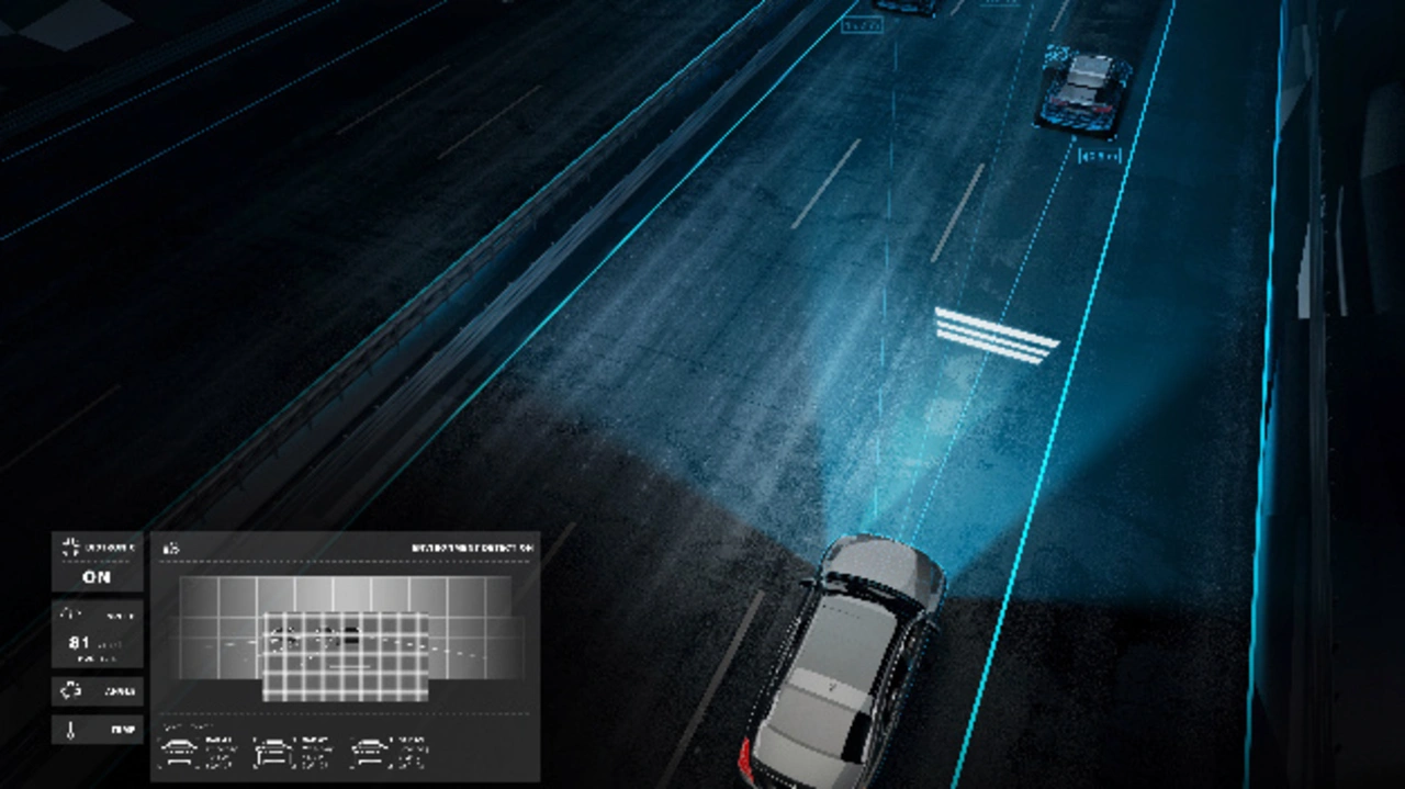 Die Scheinwerfertechnik liefert als integraler Bestandteil der Gesamtstrategie »Intelligent Drive« einen wichtigen Beitrag zur Verbesserung der Verkehrssicherheit. Im Scheinwerfer ermöglichen Chips, die von Texas Instruments entwickelt wurden, mit über einer Million Mikrospiegeln eine Auflösung in HD-Qualität.