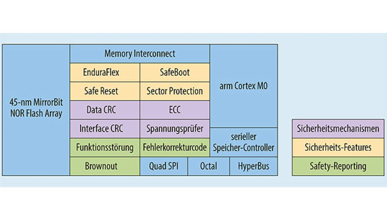 Cypress Semiconductor hat auf diese Nachfrage reagiert und neue Technologien und Merkmale in seine NOR-Flash-Produktfamilie Semper eingeführt, die für Automotive-Anwendungen ausgelegt ist, bei denen es um funktionale Sicherheit geht. Die Bausteine bieten nun Diagnose-, Schutz- und Wiederherstellungsfunktionen in jedem der oben genannten Fehler¬modi: Systemausfall, Speicherbetriebsfehler und Schnittstellenfehler. Die neuartige Architektur der Semper-Familie be¬inhaltet einen CPU-Kern (Arm Cortex-M0) für die Verwaltung des komplexen Betriebs des Speicherbausteins und zur Übertragung von Status und Flags an den Host-SoC (Bild 3).