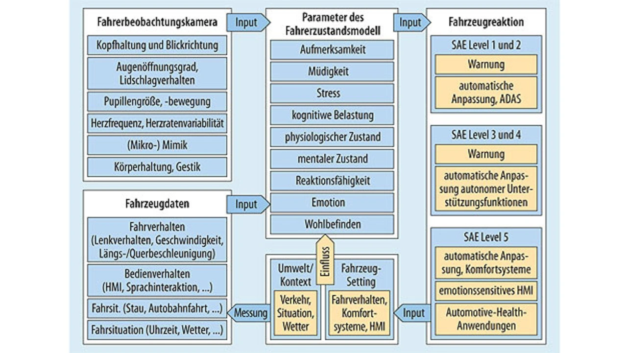 Neben der genauen Erfassung einzelner Messparameter der Fahrerbeobachtungskamera (Bild 4, linker Block) bedarf es einer geeigneten Modellierung des Fahrerzustands. Passende Parameter des Fahrerzustandsmodells sind im mittleren Block (Bild 4) ersichtlich.