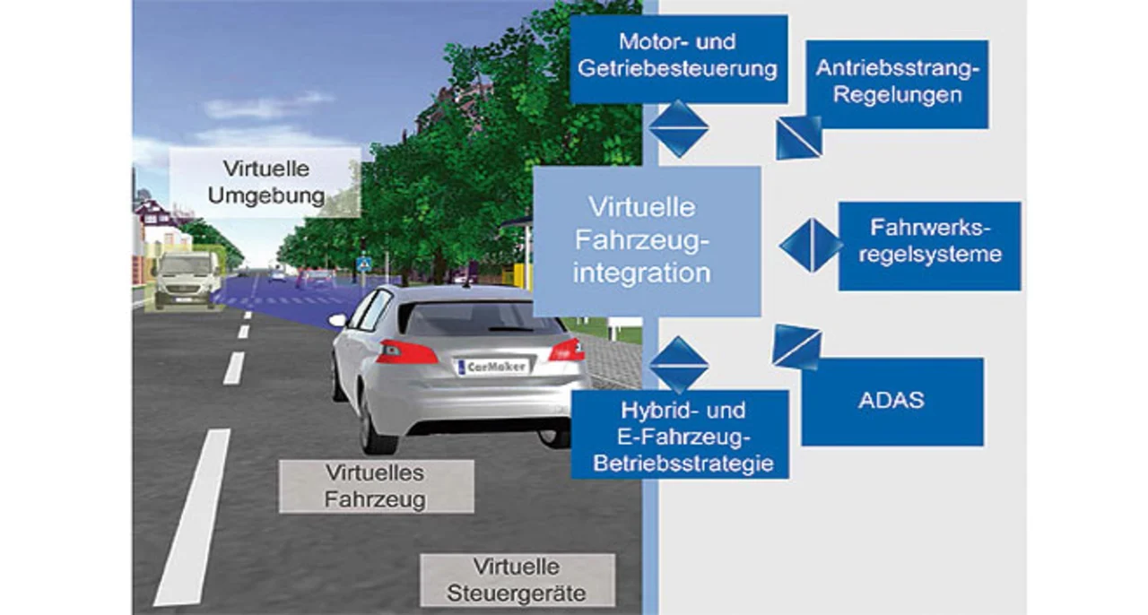 Durch Nutzung eines virtuellen Fahrzeugs und entsprechender Simulationsmodelle ist auch ein virtueller Fahrversuch möglich. Das virtuelle Fahrzeug hat dabei wie ein reales Fahrzeug verschiedene Komponenten wie Motor, Antriebsstrang, Fahrerassistenzsysteme und vieles mehr (Bild 1). Fast jede Komponente verfügt über ein oder mehrere eigene Steuergeräte. Im Rahmen der Validierung von Steuergeräte-Software wird also ein virtuelles Steuergerät als Bestandteil des virtuellen Gesamtsystems in einem virtuellen Verkehrsszenario getestet.