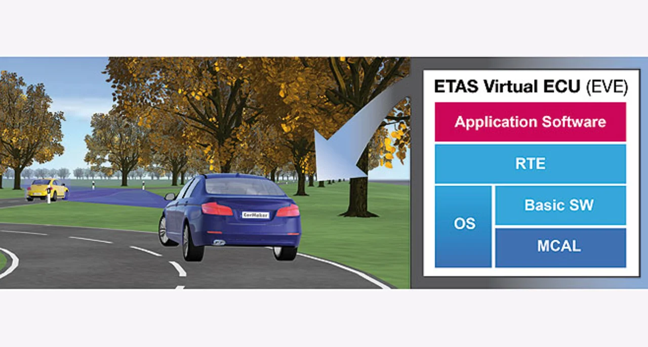 Eine konkrete Lösung, die den beschriebenen Anforderungen genügt, bieten die ETAS GmbH und die IPG Automotive GmbH. Der gemeinsame Ansatz basiert auf dem virtuellen Steuergerät EVE (ETAS Virtual ECU) sowie der offenen Integrations- und Testplattform CarMaker von IPG Automotive (Bild 2).