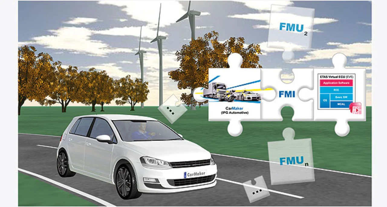 Für die Validierung von Steuergeräte-Software wird die zu testende Software im ersten Schritt in das virtuelle Steuergerät EVE integriert. Dieses kann anschließend als Functional Mock-up Unit (FMU) exportiert und über die standardisierte FMI-Schnittstelle in CarMaker integriert werden (Bild 3).